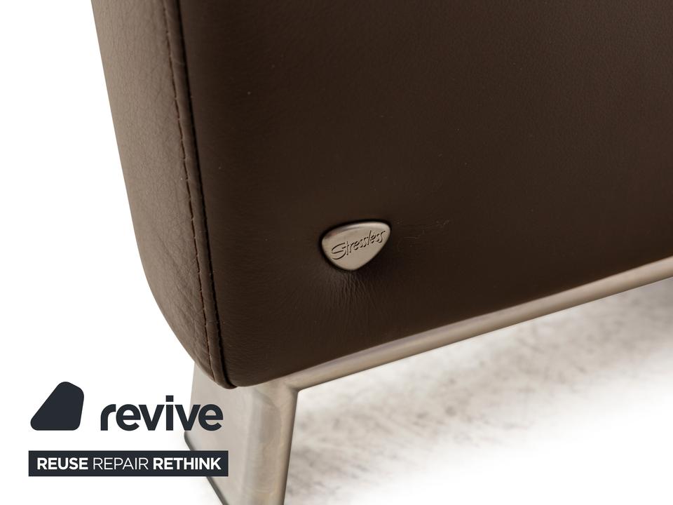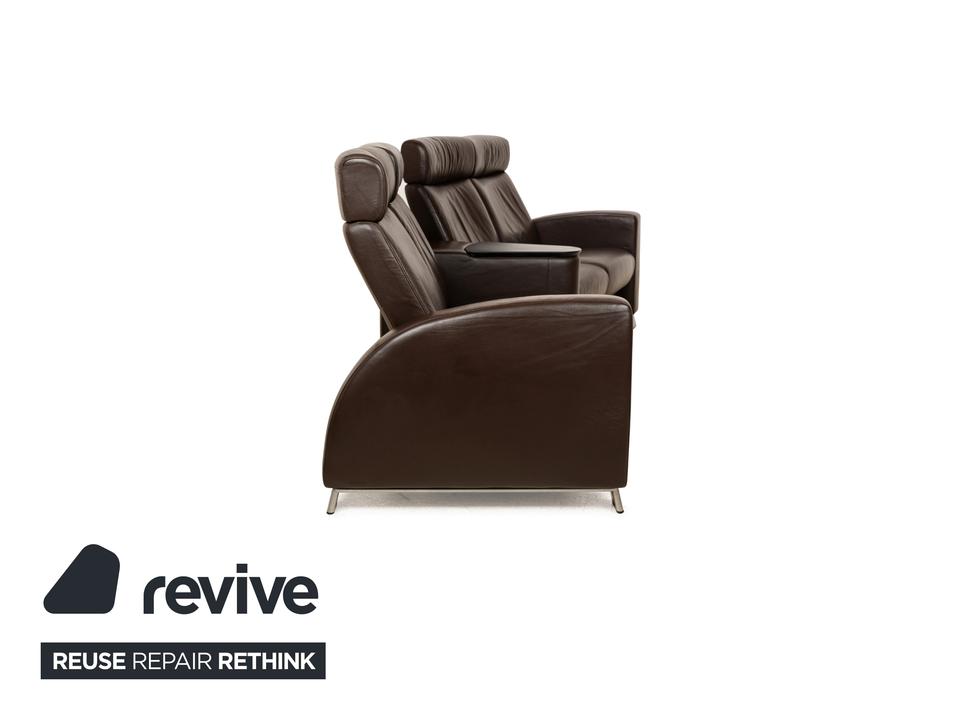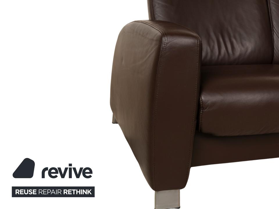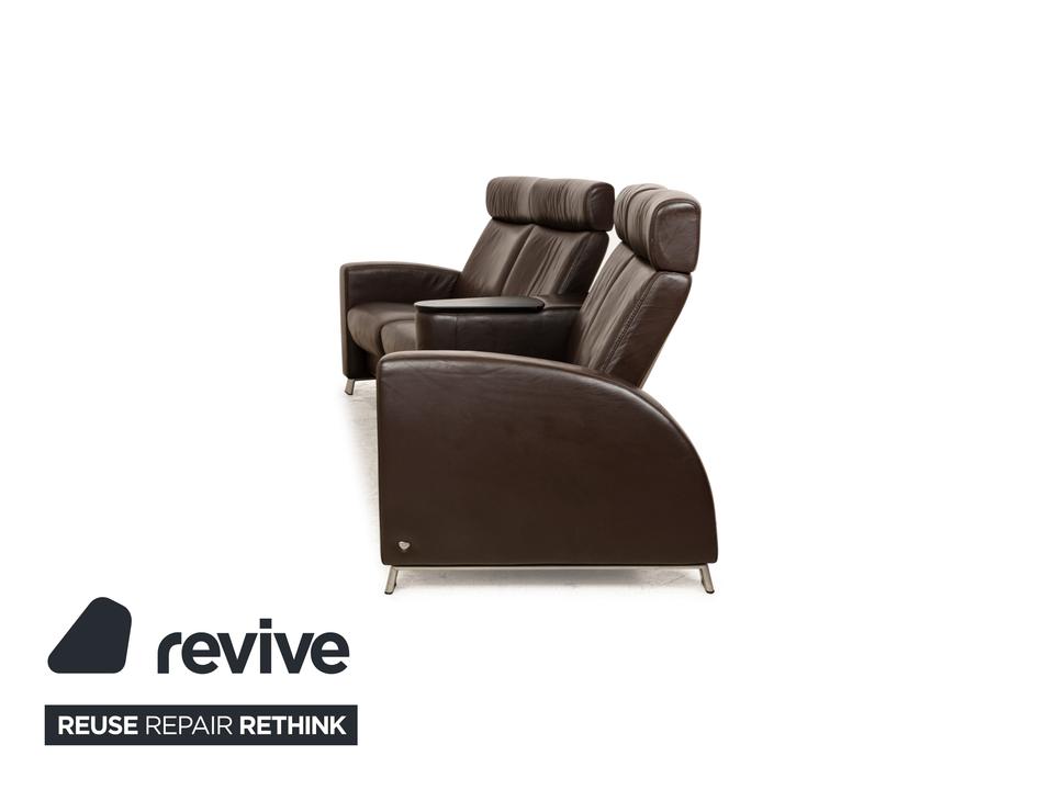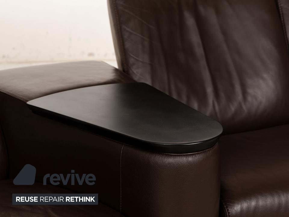Der Viersitzer Arion von Stressless ist mit dunkelbraunem Leder bezogen und steht auf flachen Metallfüßen. Er zeichnet sich durch die verstellbaren Kopfstützen und die komfortable Holzablage und das für den Hersteller typische Design aus. Jede Sitzfläche lässt sich individuell in eine Relaxposition bringen.
