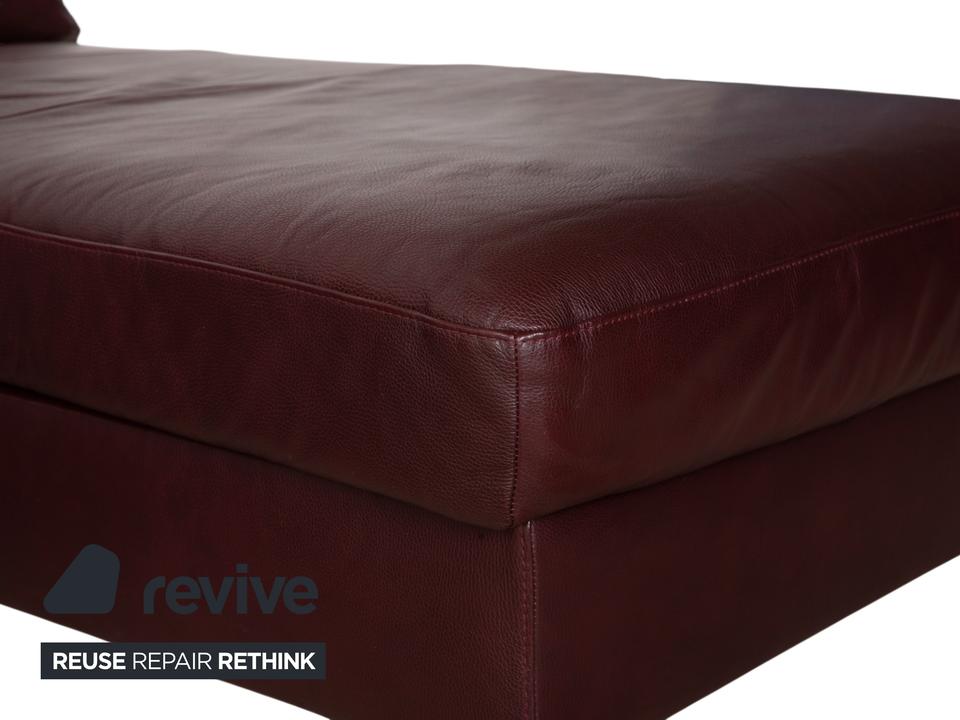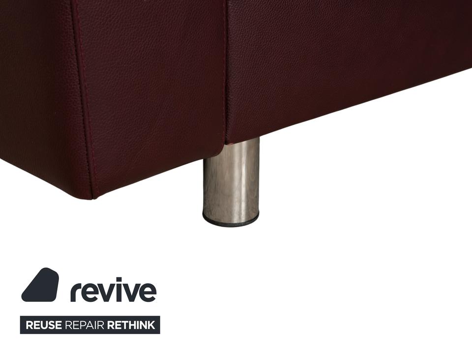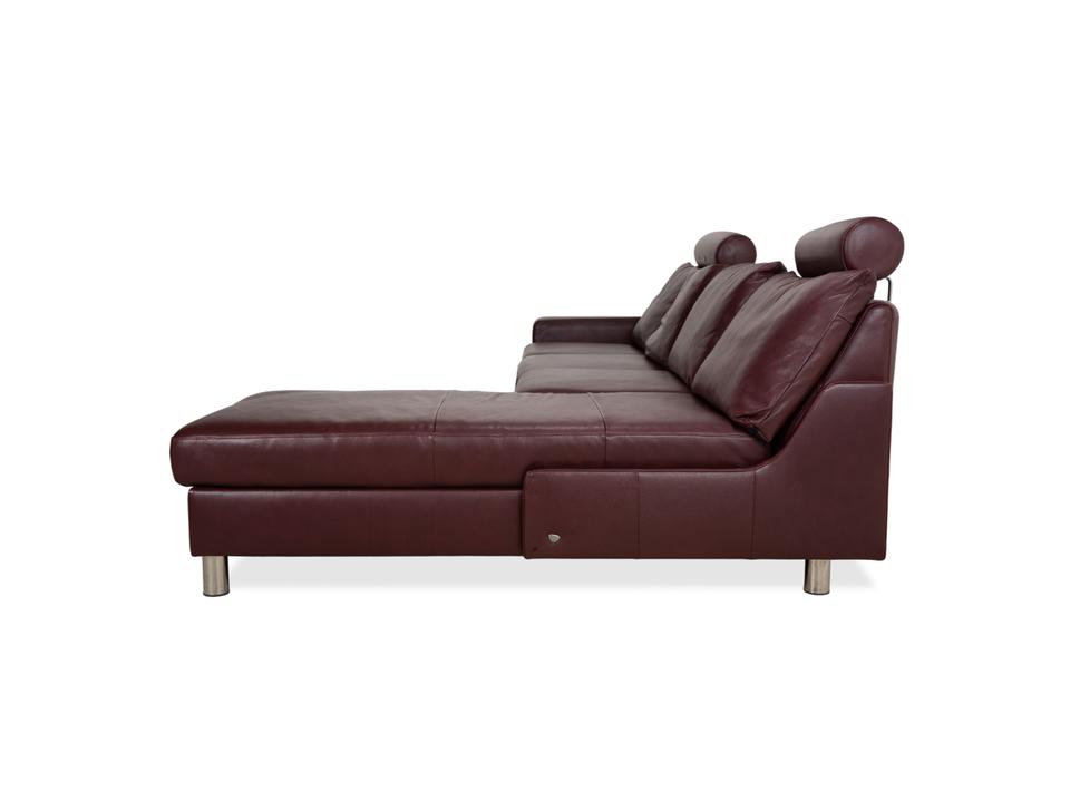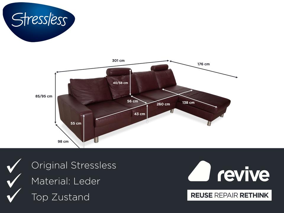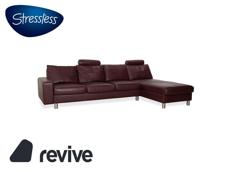 Stressless E200: Skandinavische Entspannung in edlem BordeauxDieses Ecksofa vereint die weltberühmte Bequemlichkeit von Stressless mit einer modernen, schlanken Linienführung. Das Modell E200 ist der Beweis, dass ergonomischer Komfort nicht „plüschig“ aussehen muss, sondern absolut designorientiert sein kann.Der Bezug ist ein hochwertiges Leder in einem satten Bordeaux-Rot. Dieser tiefe Farbton erinnert an ein gutes Glas Rotwein und bringt sofort eine warme, leidenschaftliche Note in dein Wohnzimmer, ohne aufdringlich zu wirken. Im Gegensatz zu den klassischen Stressless-Sesseln wirkt das E200 Sofa durch seine klare, kubische Form und die schlanken Edelstahl-Füße sehr leicht und bodenfrei.Doch der wahre Zauber steckt im Inneren: Das Modell ist bekannt für das patentierte ErgoAdapt™-System (die Sitzfläche neigt sich automatisch leicht, um den Körper perfekt aufzunehmen). Zusätzlich sorgen die aufgesteckten Kopfstützen für eine optimale Entlastung des Nackens. Die offene Recamiere auf der rechten Seite lädt förmlich dazu ein, sich lang zu machen und den Alltag zu vergessen.