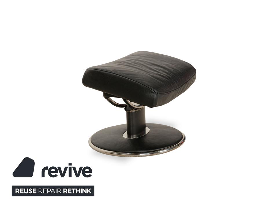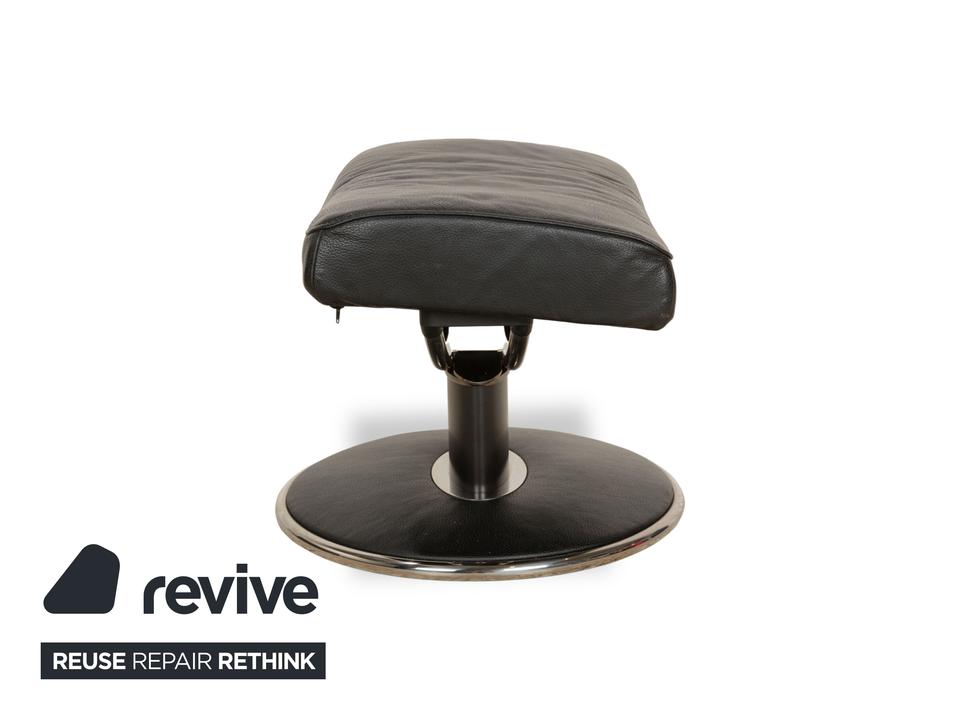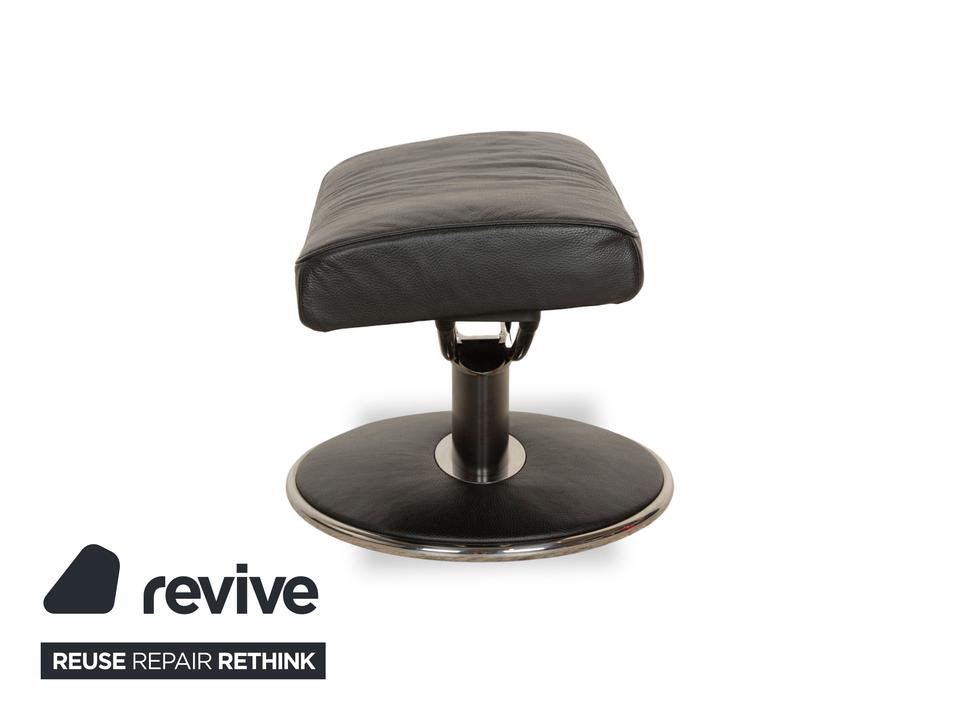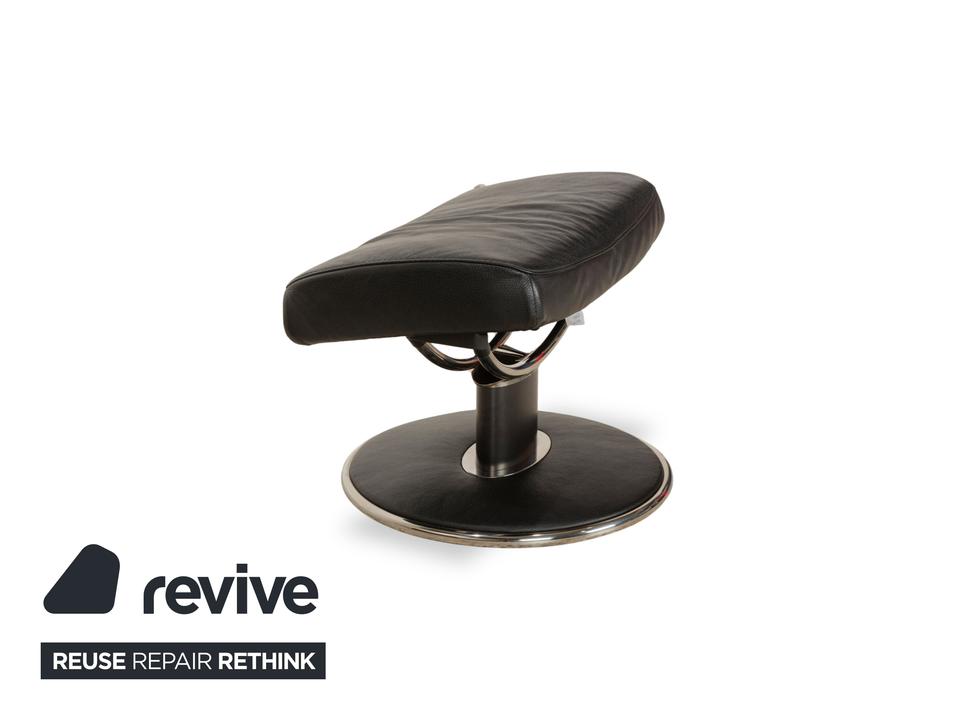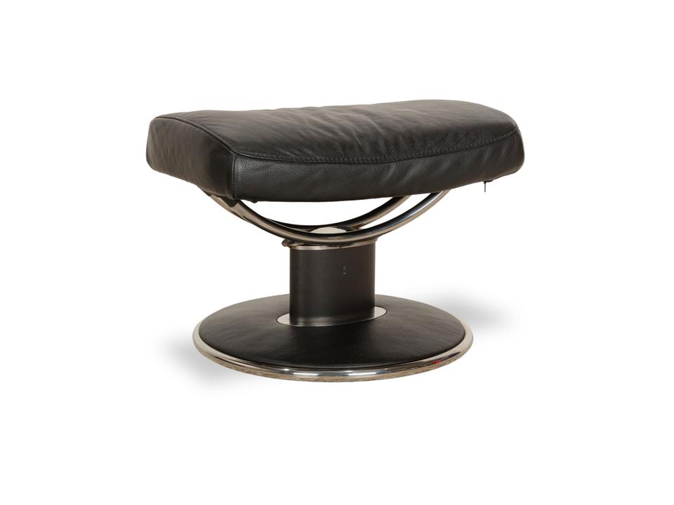 Der Hocker Jazz von Stressless ist mit einem schwarzen Echtleder bezogen und steht auf einem Gestell aus Leder und Chrom. Weiche Polster und die Möglichkeit zur individuellen Neigung des Sitzes sorgen für Entspannung und Komfort.
