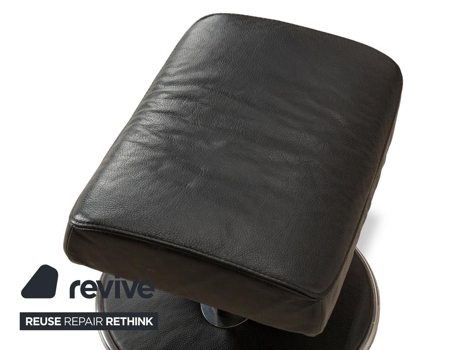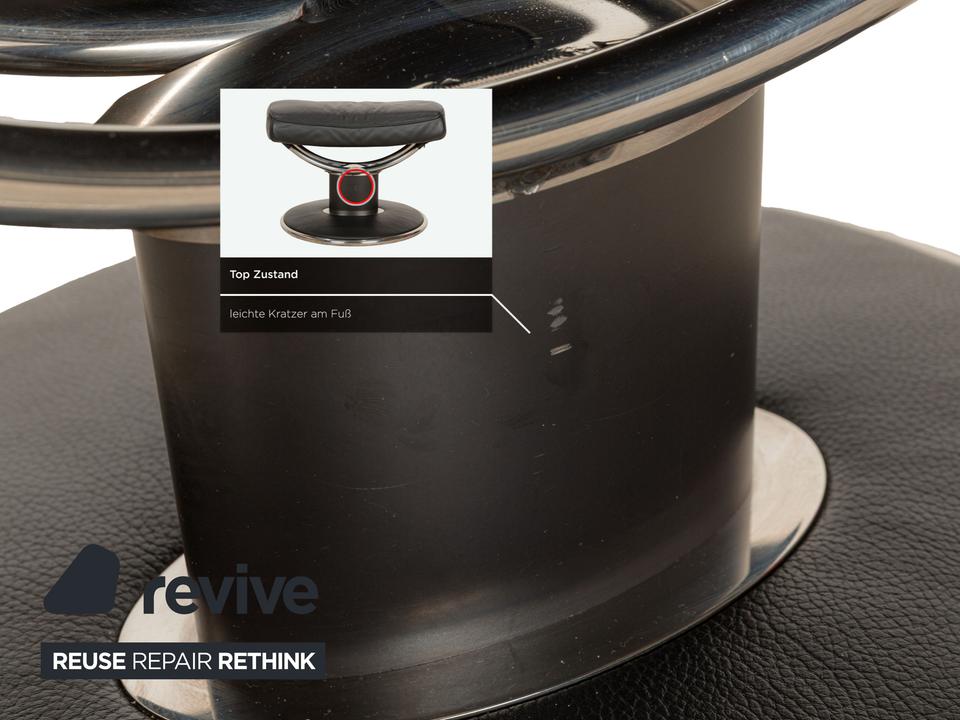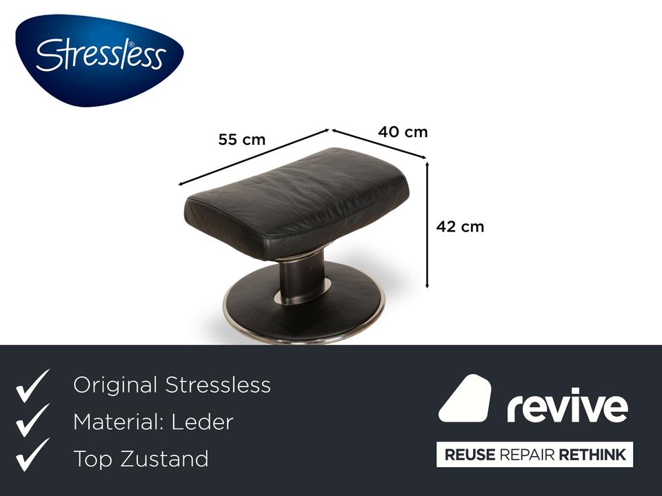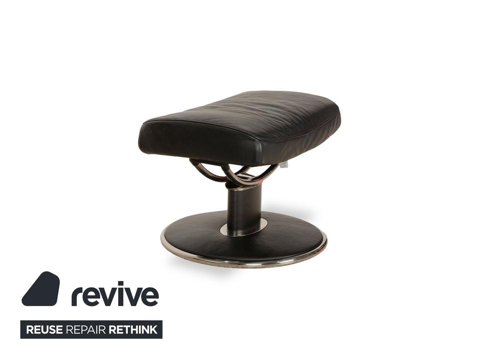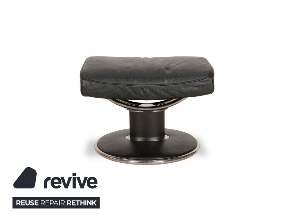 Der Hocker Jazz von Stressless ist mit einem schwarzen Echtleder bezogen und steht auf einem Gestell aus Leder und Chrom. Weiche Polster und die Möglichkeit zur individuellen Neigung des Sitzes sorgen für Entspannung und Komfort.