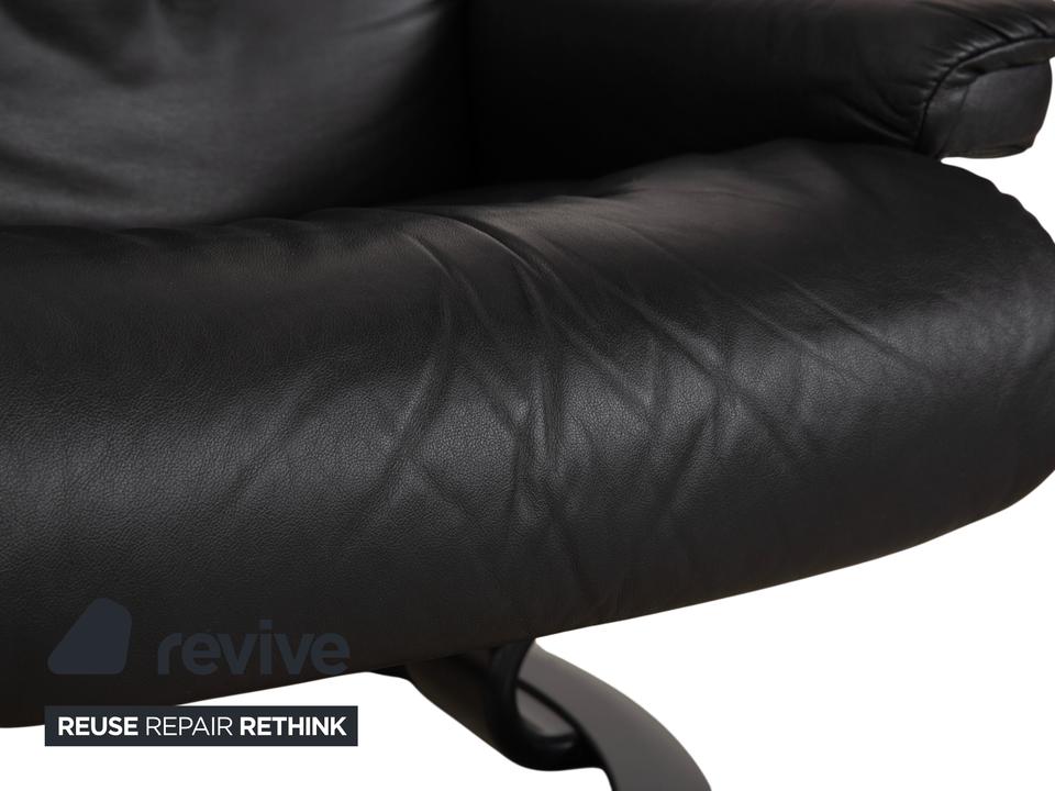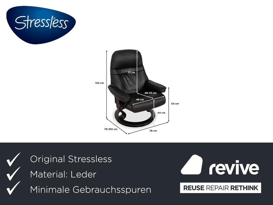 Mit dem Modell „Sunrise“ von Stressless holst du dir den Inbegriff skandinavischer Gemütlichkeit und Ergonomie ins Haus. Dieser Sessel gehört zu den beliebtesten Klassikern der norwegischen Marke und ist darauf ausgelegt, dir perfekte Erholung zu bieten.Der Bezug besteht aus einem hochwertigen, geschmeidigen Leder in einem tiefen Dunkelgrau bis Anthrazit, was dem Möbelstück eine sehr edle und zeitlose Ausstrahlung verleiht. Die Polsterung ist üppig und weich, wobei die charakteristischen Steppnähte im Rücken für eine optische Gliederung sorgen.Getragen wird der Sessel vom klassischen Stressless-Ringgestell aus dunklem Holz, das hier farblich perfekt auf das Leder abgestimmt ist und für Stabilität sorgt. Über das seitliche Drehrad lässt sich der Widerstand der manuellen Relaxfunktion (das patentierte Gleitsystem) individuell einstellen. So folgt der Sessel sanft jeder deiner Bewegungen und gleitet mühelos in eine entspannte Liegeposition.