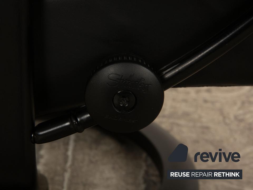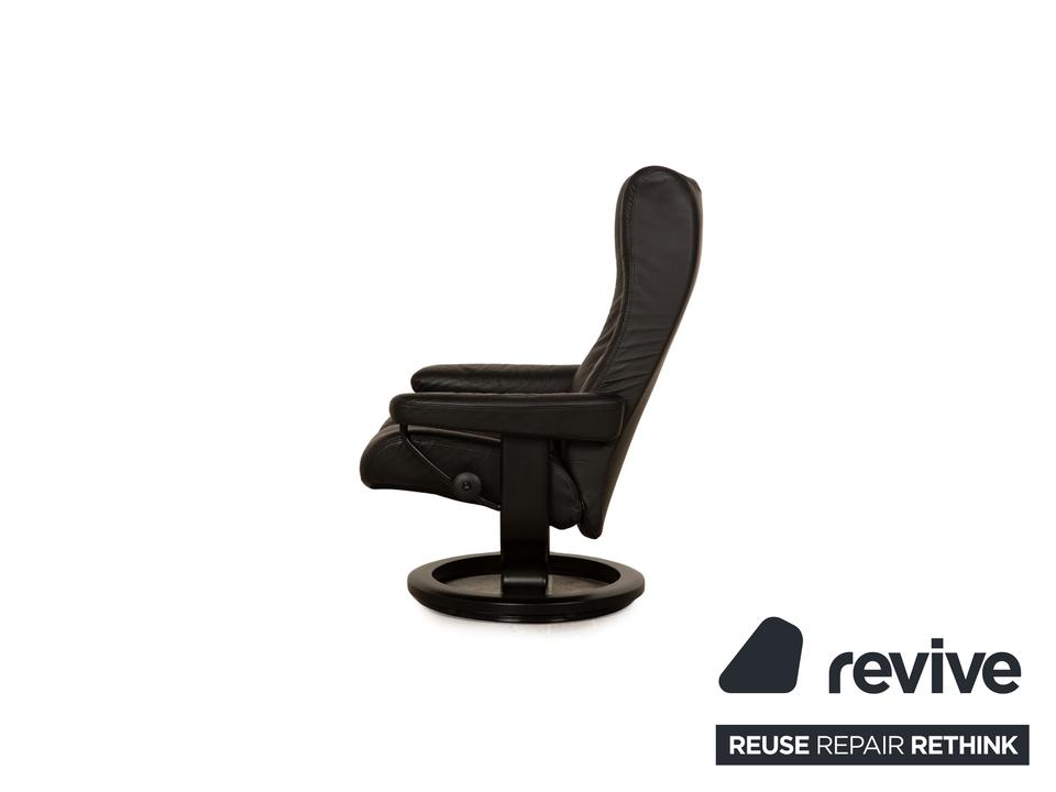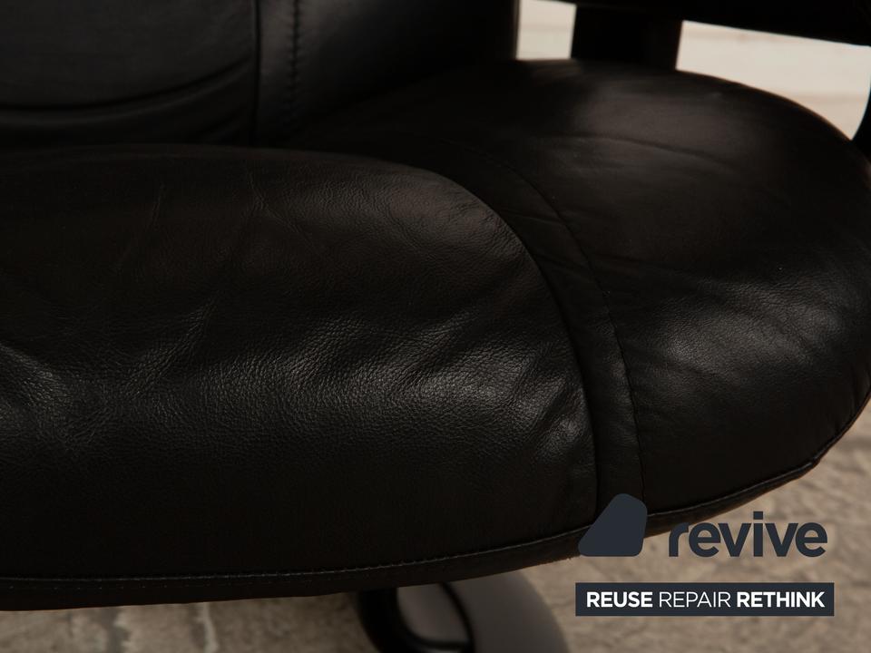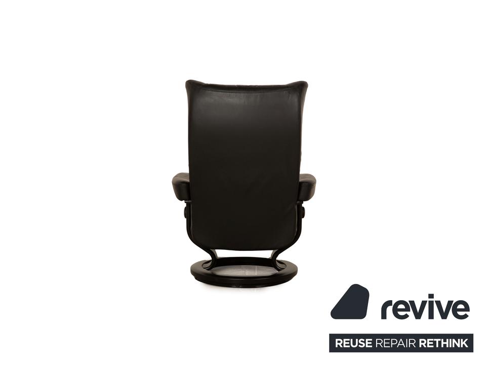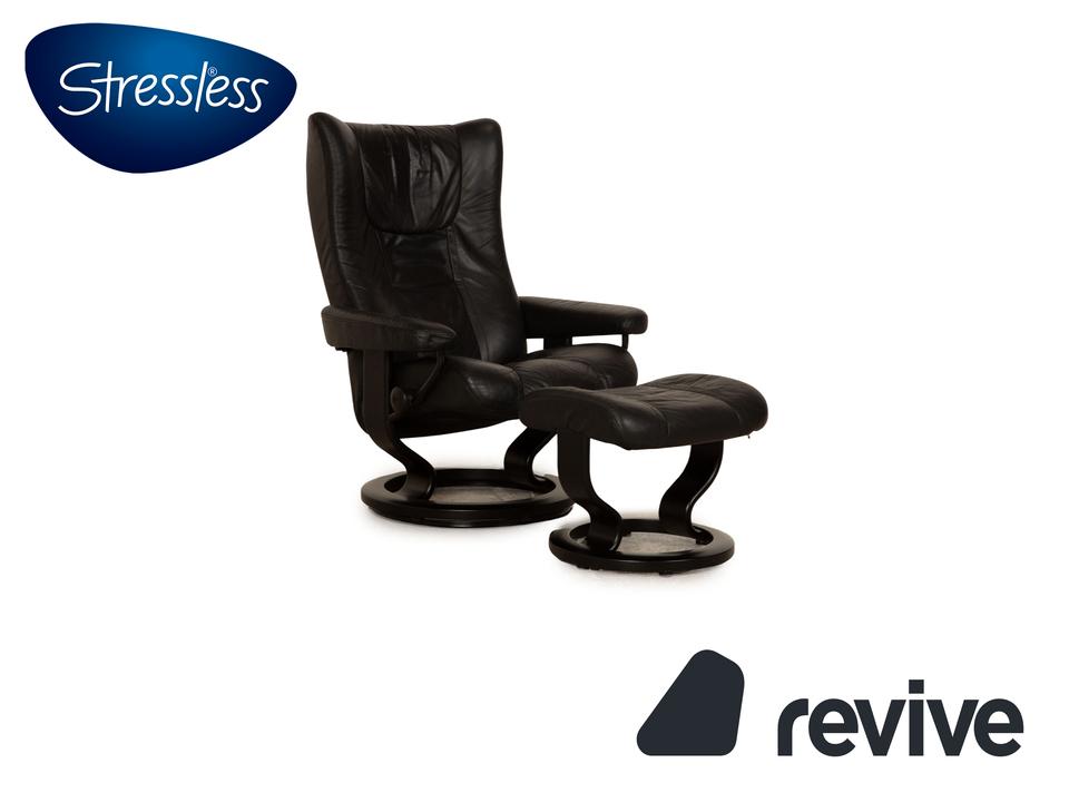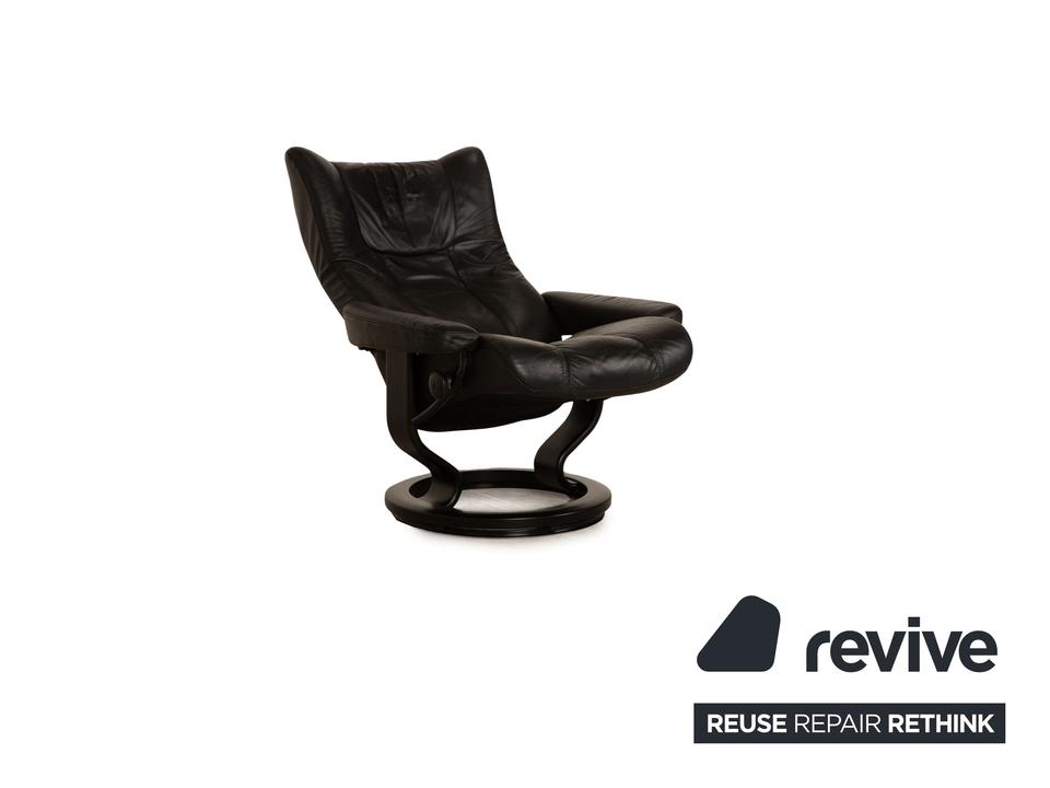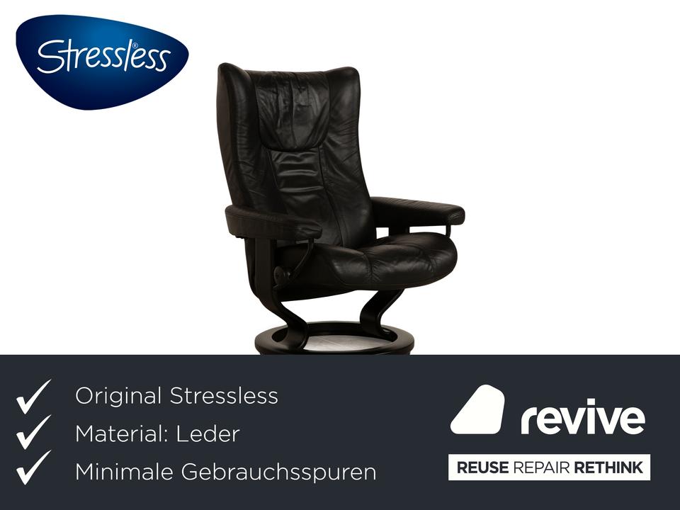Der Wing Sessel von Stressless ist mit einem schwarzen Echtleder bezogen und steht auf einem runden Holzfuß. Der praktische Beistellhocker und die Relaxfunktion zeichnen ihn aus.