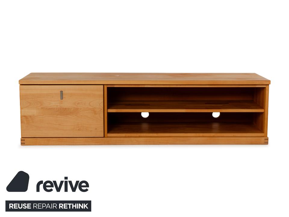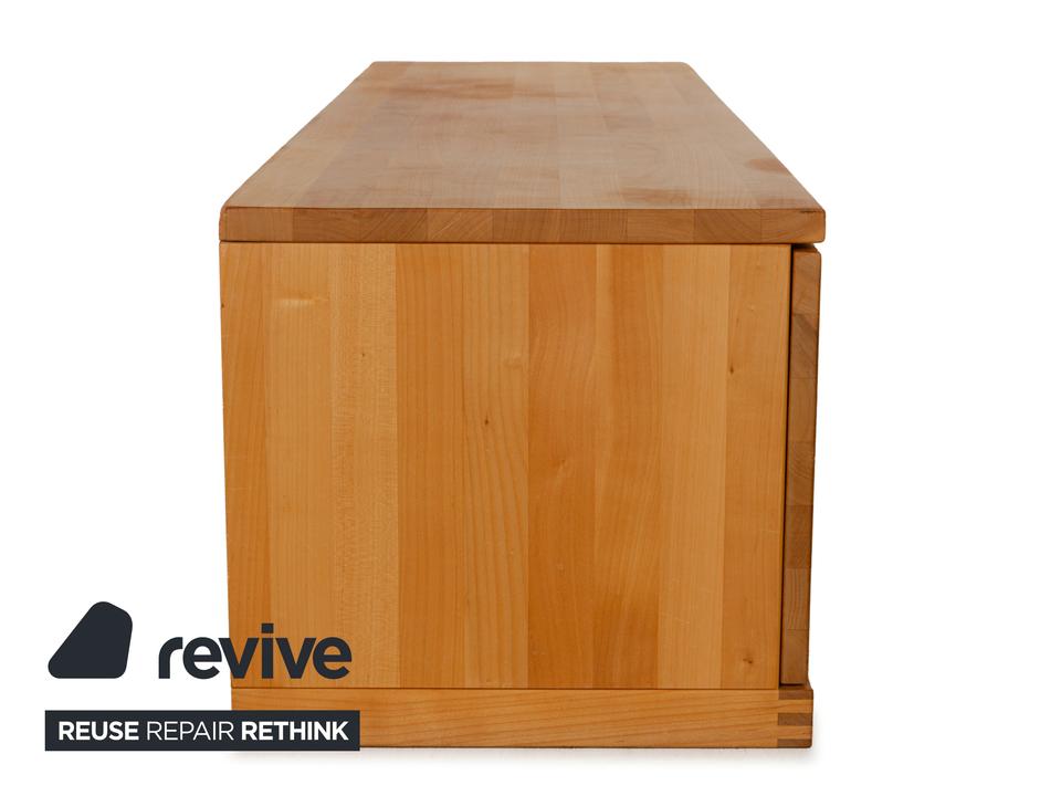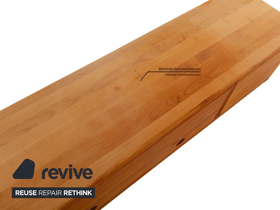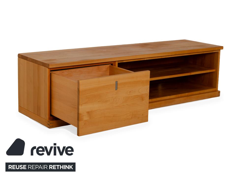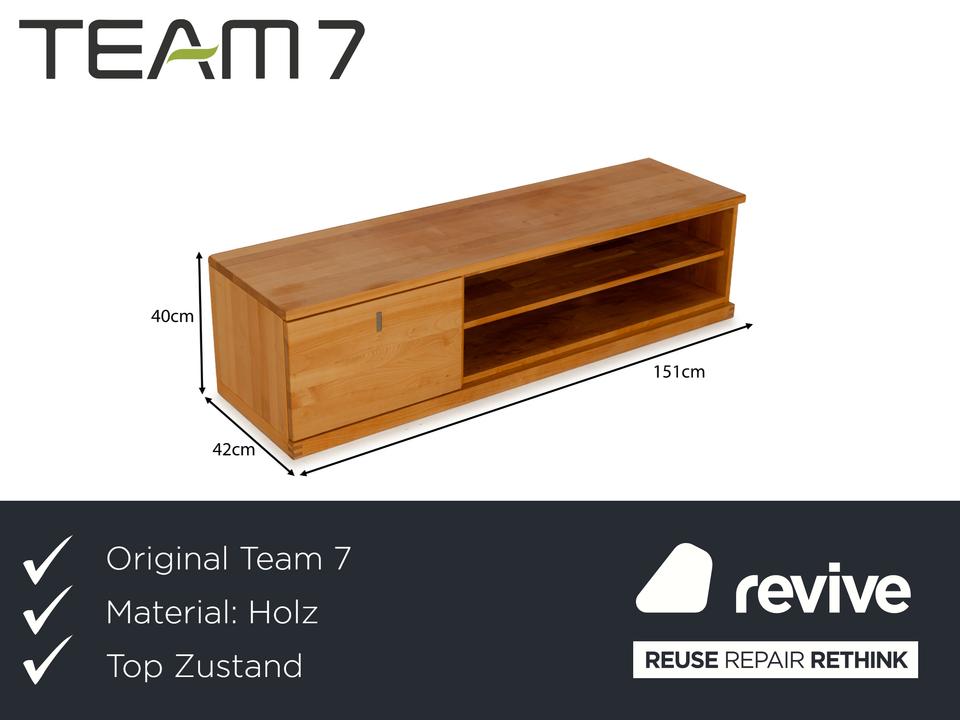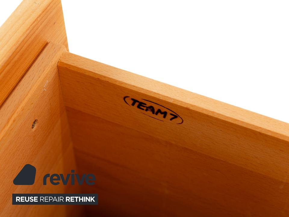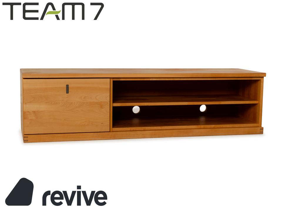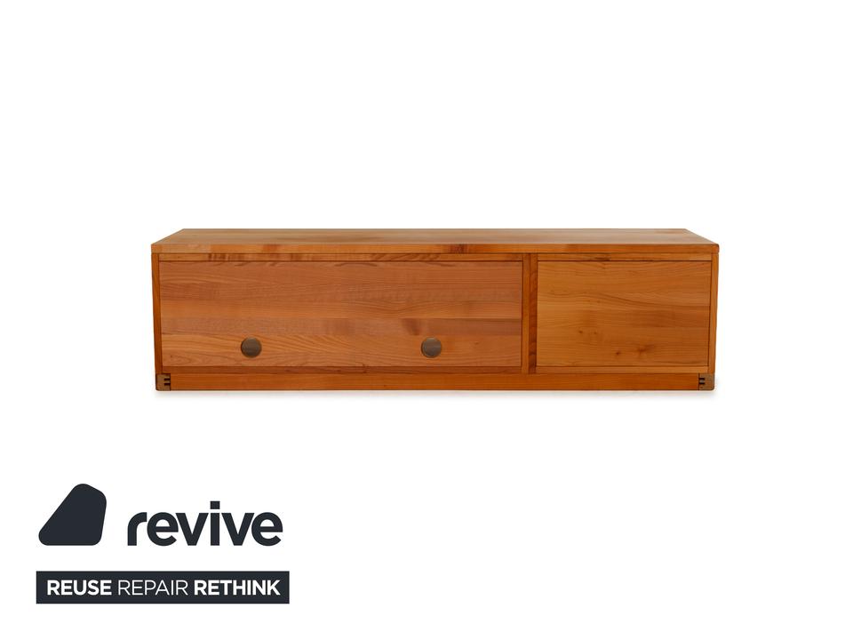 Das Sideboard von Team7 ist aus massivem Holz in braun gefertigt und steht bodentief auf. Ein hoher Schubladenauszug mit bündig schließendem Griff als Akzent und zwei offene Fächer bieten viel Stauraum. Das Lowboard verfügt über Kabeldurchlässe in der Rückwand des unteren Fachs, wodurch es sich auch als Mediaboard eignet und so zum Beispiel perfekt im Wohnzimmer Verwendung finden kann.