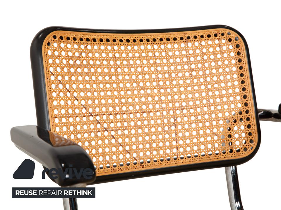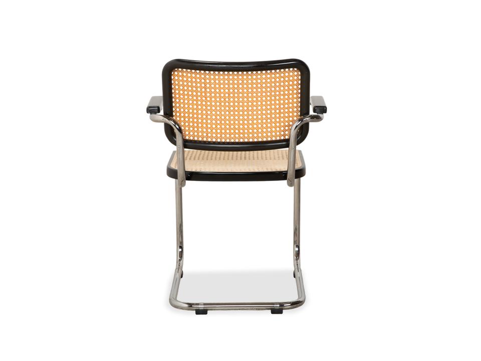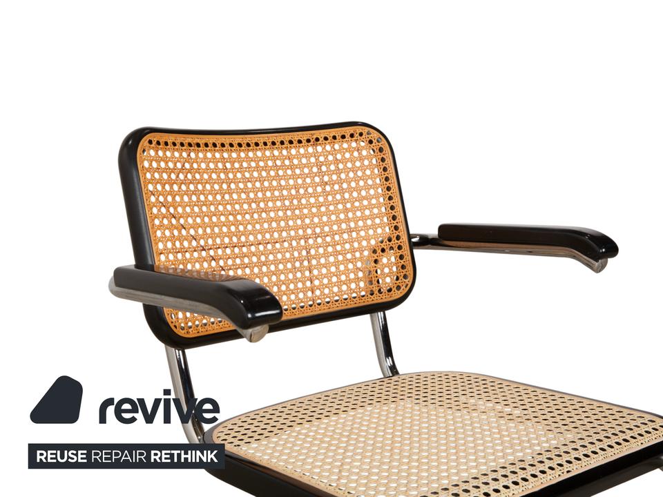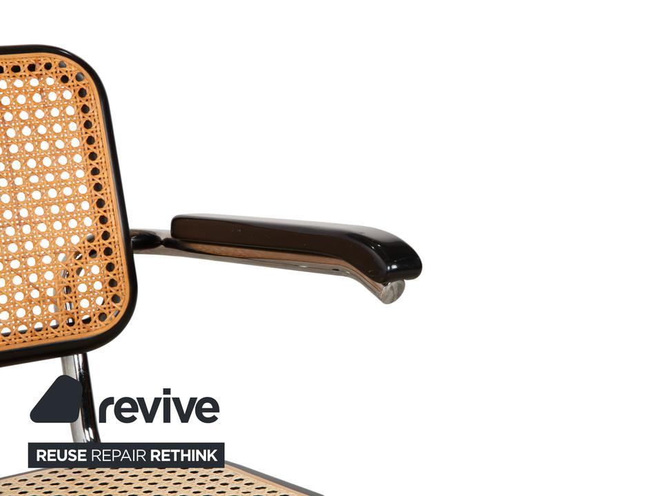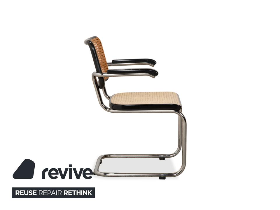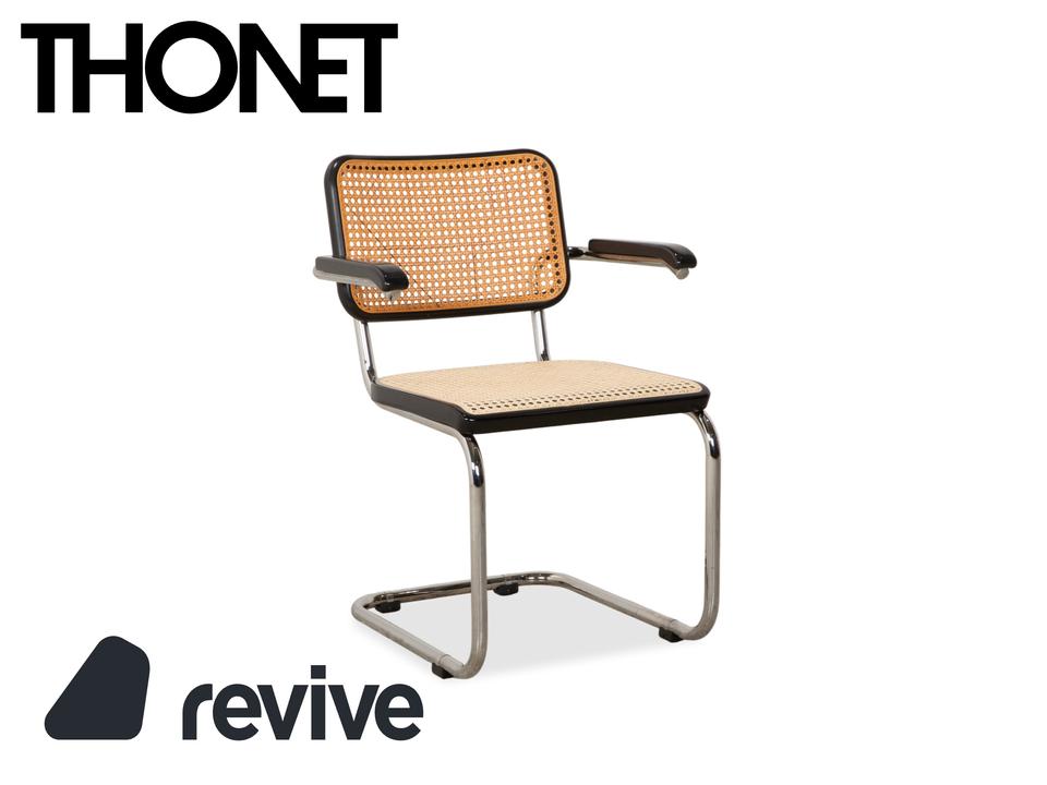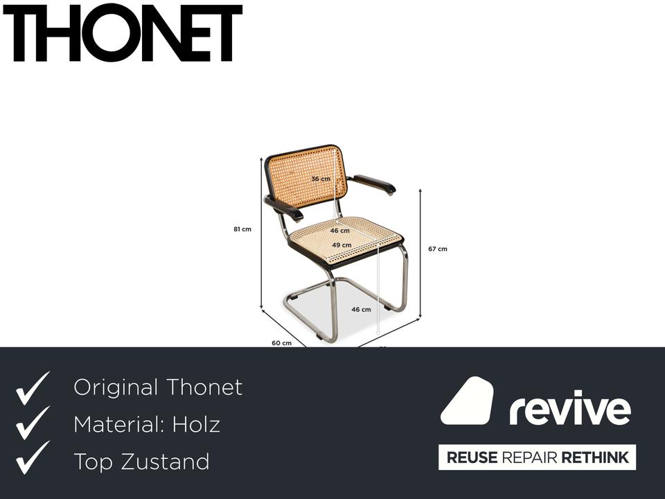 Thonet S 64: Die Ikone des Bauhaus-DesignsDieser Stuhl ist weit mehr als eine Sitzgelegenheit – er ist das vielleicht berühmteste Möbelstück der Designgeschichte. Mit dem S 64 (dem Modell mit Armlehnen) holst du dir den zeitlosen Geist von Marcel Breuer in deine vier Wände.Die Ästhetik lebt von einem faszinierenden Kontrast: Das schwarz gebeizte Buchenholz bildet einen markanten Rahmen für das helle, luftige Wiener Geflecht in Sitz und Rücken. Dieses natürliche Material nimmt der strengen Form die Schwere und sorgt für Transparenz.Getragen wird die Konstruktion vom legendären verchromten Stahlrohr-Gestell, das in einer einzigen geschwungenen Linie verläuft. Als Freischwinger bietet der Stuhl einen einzigartigen Komfort, da er bei Bewegungen sanft nachgibt. Die schwarzen Holzarmlehnen runden das ergonomische Erlebnis ab und unterstreichen die grafische Klarheit des Entwurfs.