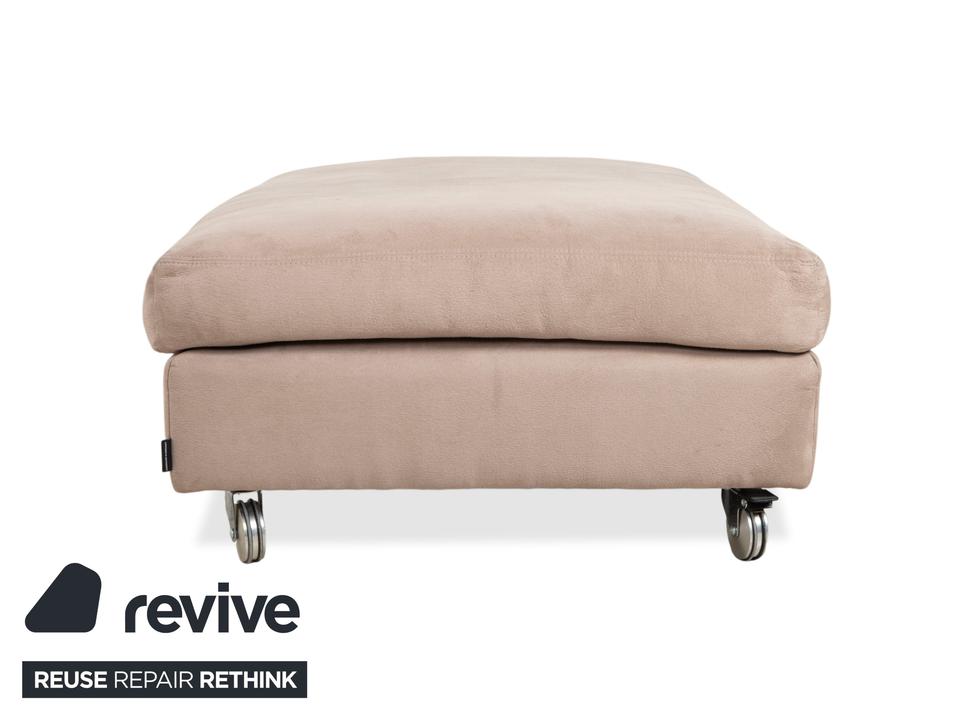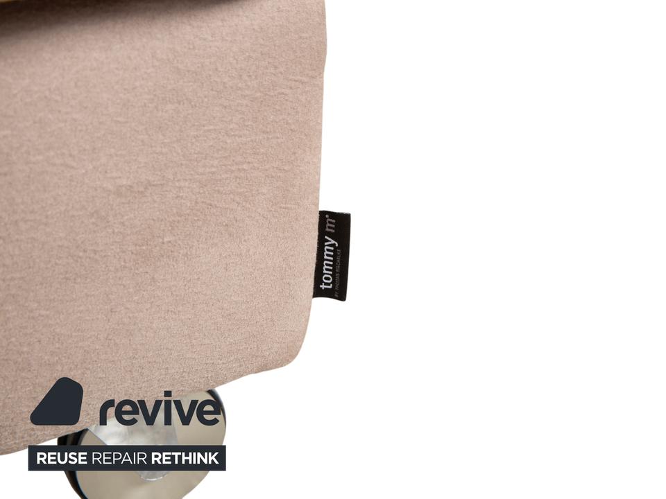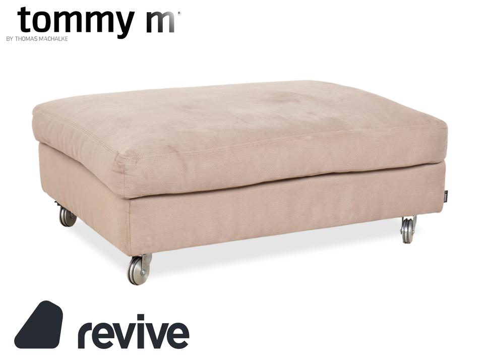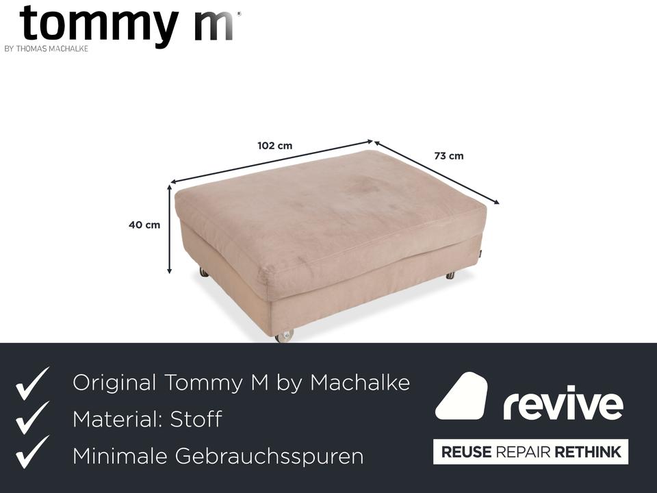 Tommy M Terano: Flexibler Loft-Chic in BeigeMit diesem Hocker des Labels Tommy M (by Machalke) holst du dir einen lässigen Alleskönner ins Haus. Das Modell „Terano“ verbindet gemütlichen Wohnkomfort mit einem Hauch von Industrial-Style.Der Hocker ist rundum in einen hochwertigen Stoff in einem sanften Beige (Sand- oder Naturton) bezogen. Die Oberfläche wirkt weich und fast samtig (ähnlich einer Velours- oder Microfaser-Optik), was dem Möbelstück eine sehr warme und einladende Ausstrahlung verleiht. Der Polsteraufbau ist rechteckig und großzügig: Eine umlaufende Naht (Biese) trennt den oberen Sitzbereich optisch vom Korpus, wodurch der Hocker wie ein großes, dickes Kissen wirkt. An der Seite ist das typische kleine Marken-Label zu erkennen, das für Qualität bürgt.Der absolute Hingucker und ein praktisches Feature sind die großen Industrie-Rollen. Statt auf festen Füßen steht der Hocker auf vier stabilen Metallrollen (Castern), die ihm nicht nur einen coolen Loft-Look verpassen, sondern ihn auch mobil machen.