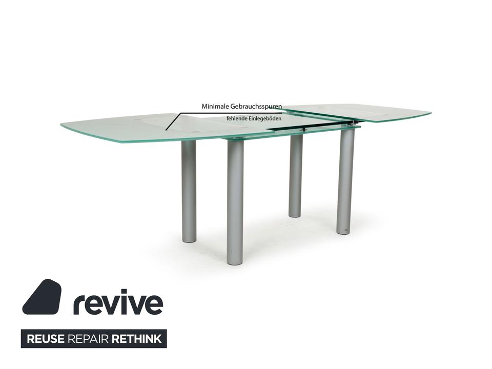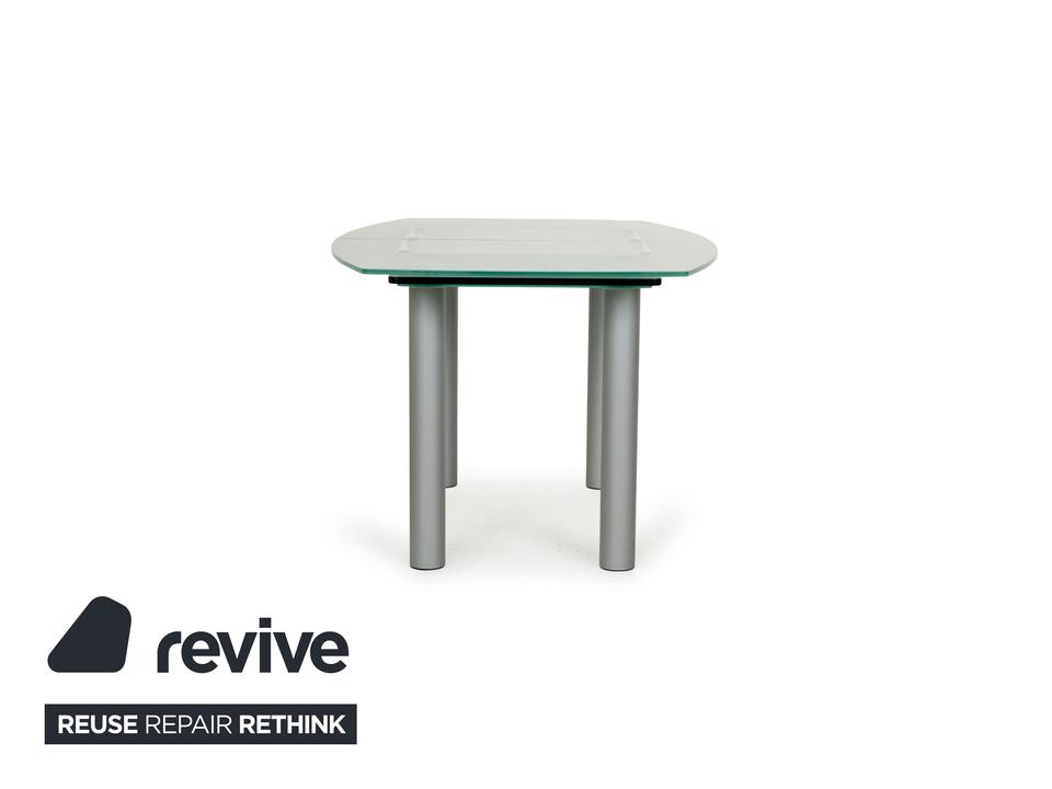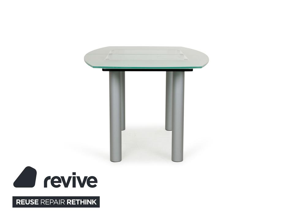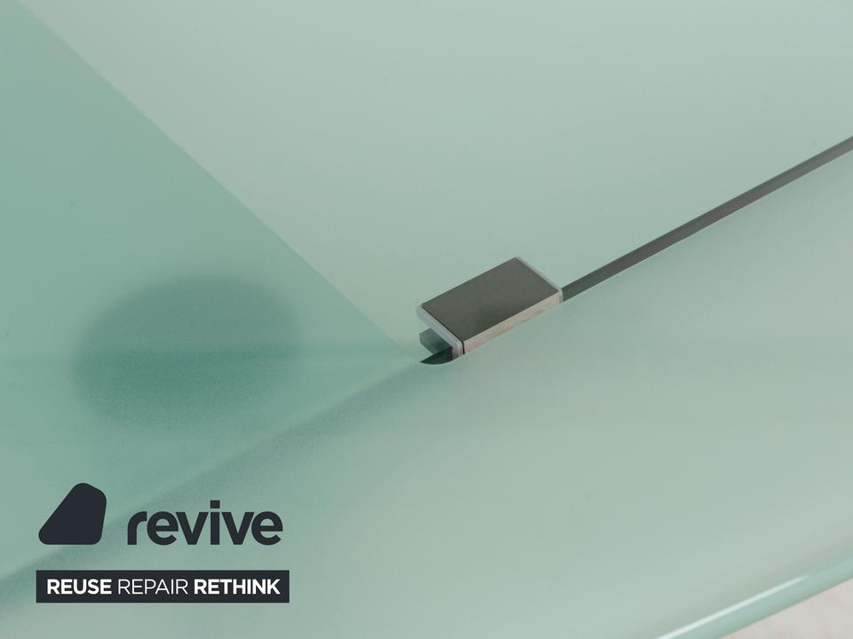 Der Glastisch Pescara von Völker Design ist aus hellgrünem, mattiertem Glas gefertigt und steht auf Metallbeinen. Sein klassisches Design und die minimale Rundung zeichnen ihn aus.
