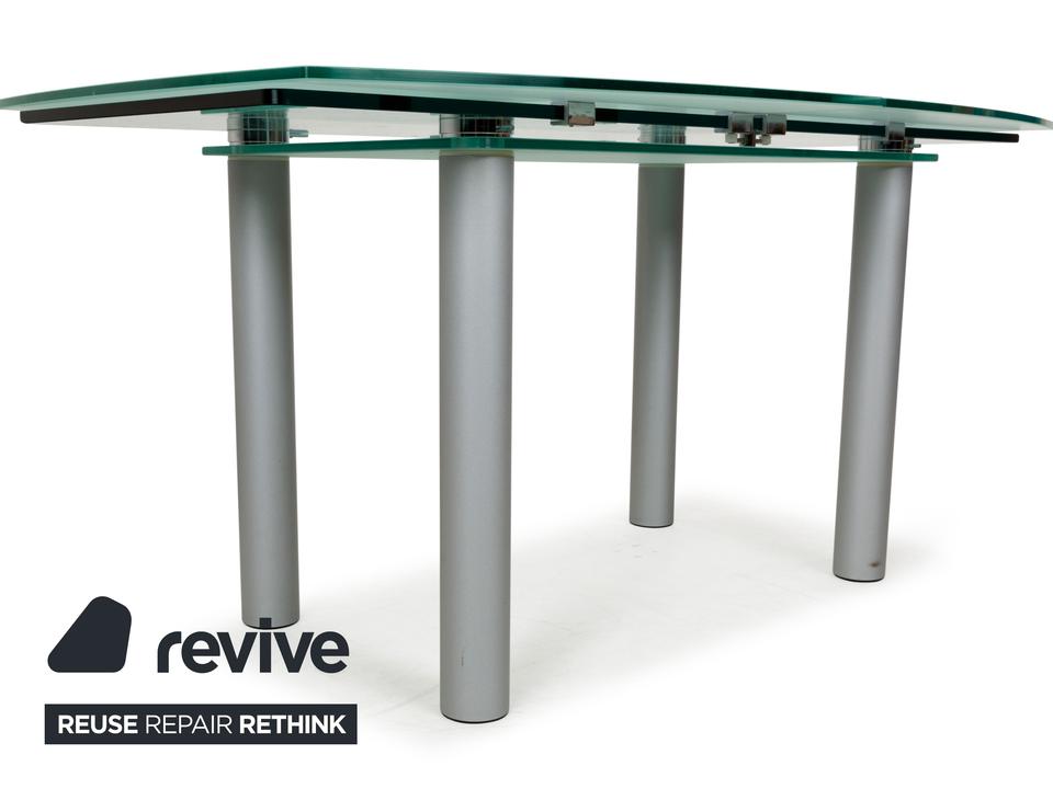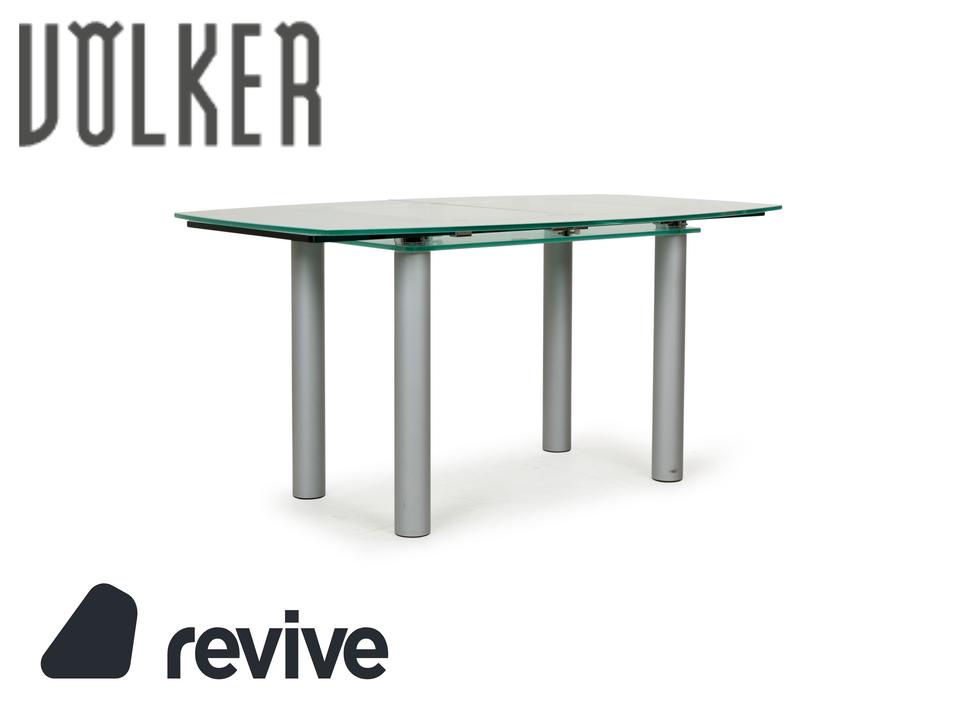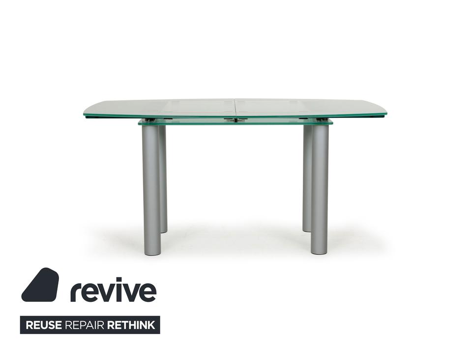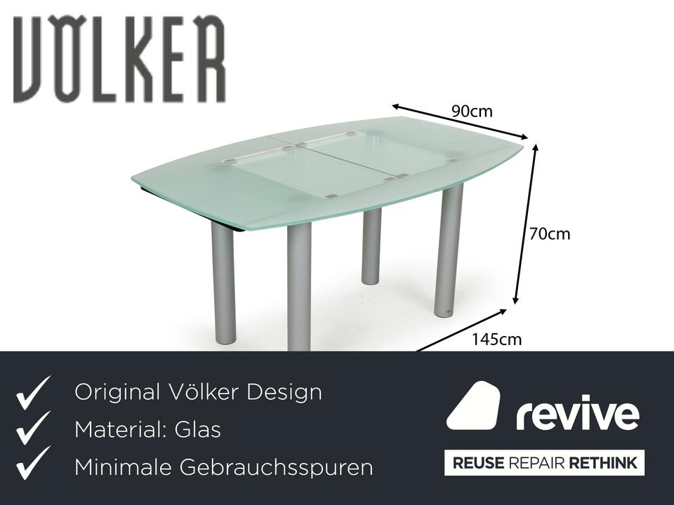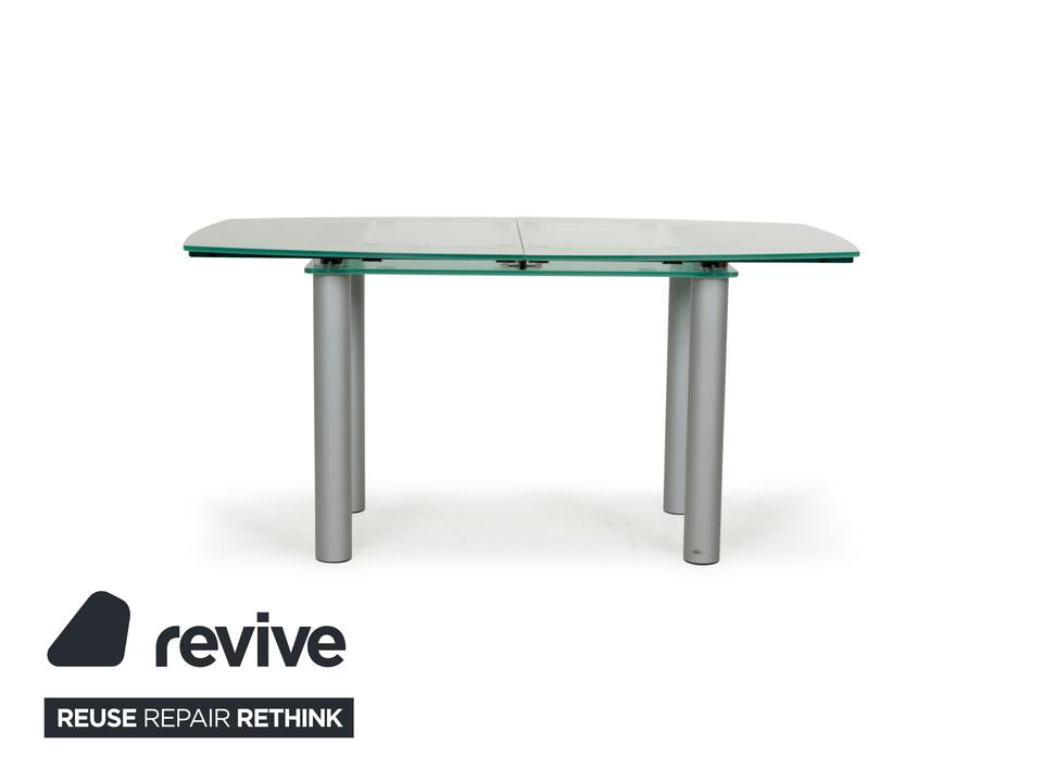 Der Glastisch Pescara von Völker Design ist aus hellgrünem, mattiertem Glas gefertigt und steht auf Metallbeinen. Sein klassisches Design und die minimale Rundung zeichnen ihn aus.