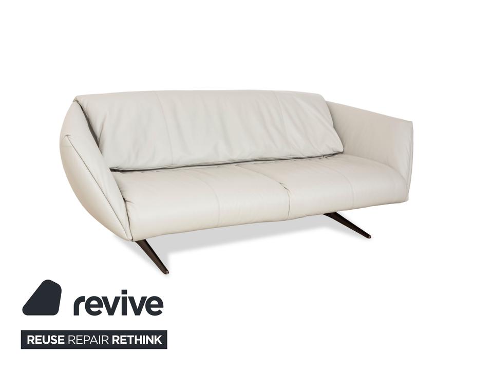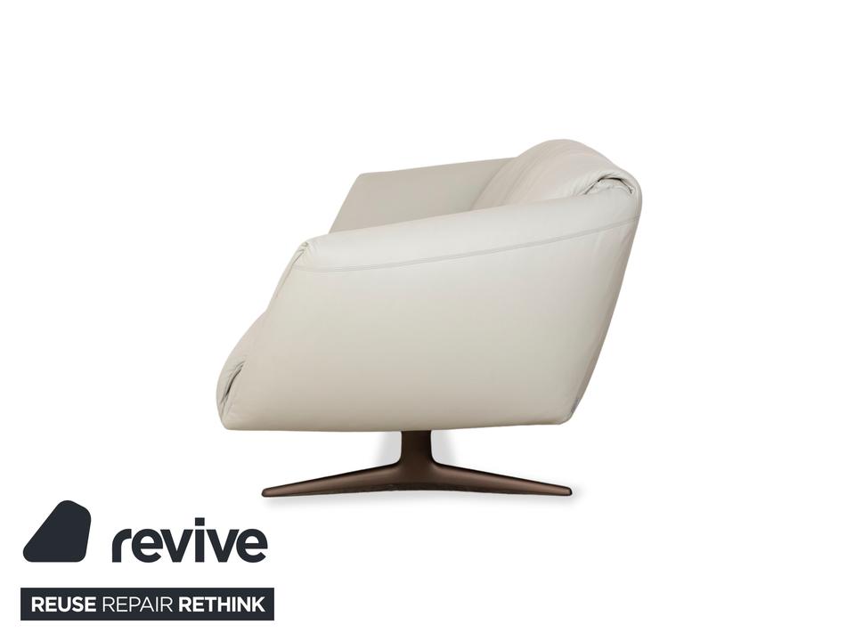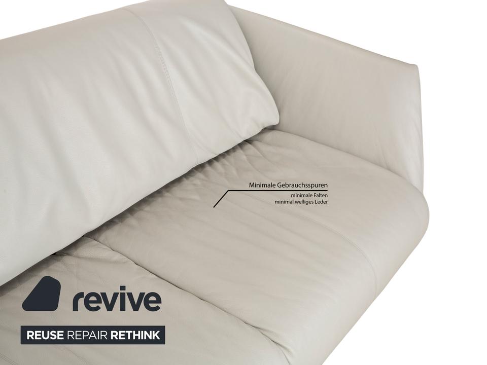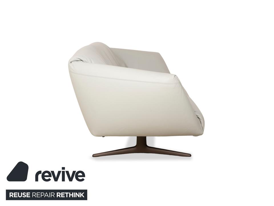 Das Sofa Bundle von Walter Knoll überzeugt durch seine außergewöhnliche Grundform. Der mit hellgrauem Echtleder bezogene Körper des Dreisitzers steht auf metallenen Kufen.