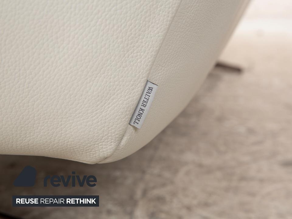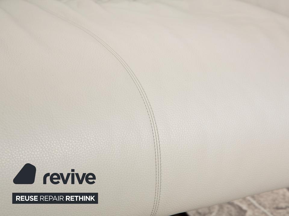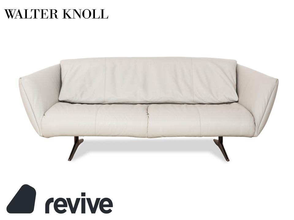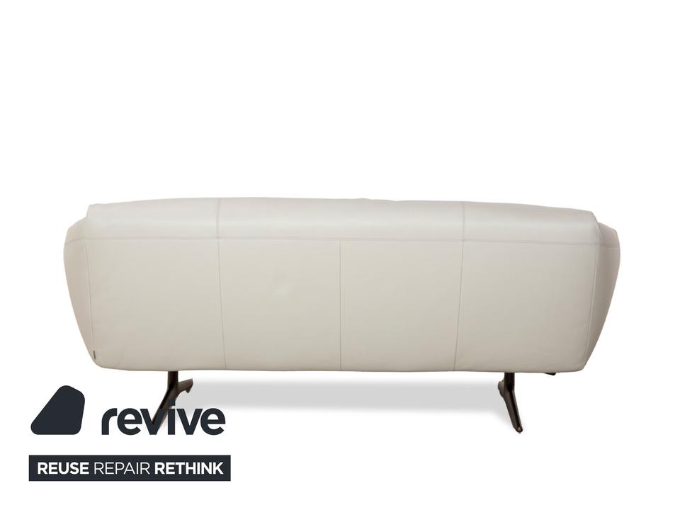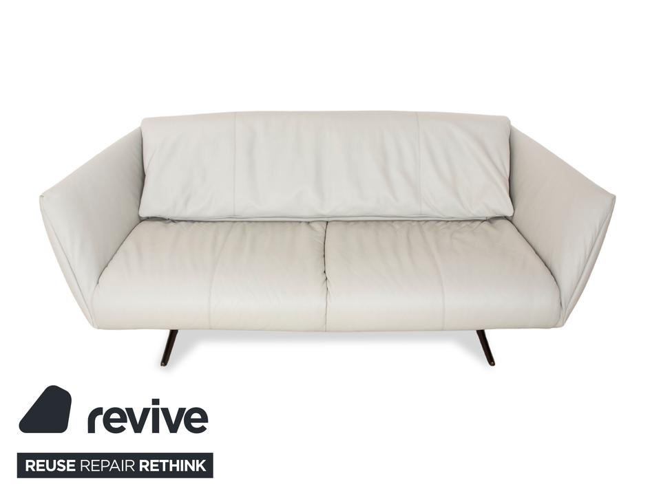 Das Sofa Bundle von Walter Knoll überzeugt durch seine außergewöhnliche Grundform. Der mit hellgrauem Echtleder bezogene Körper des Dreisitzers steht auf metallenen Kufen.