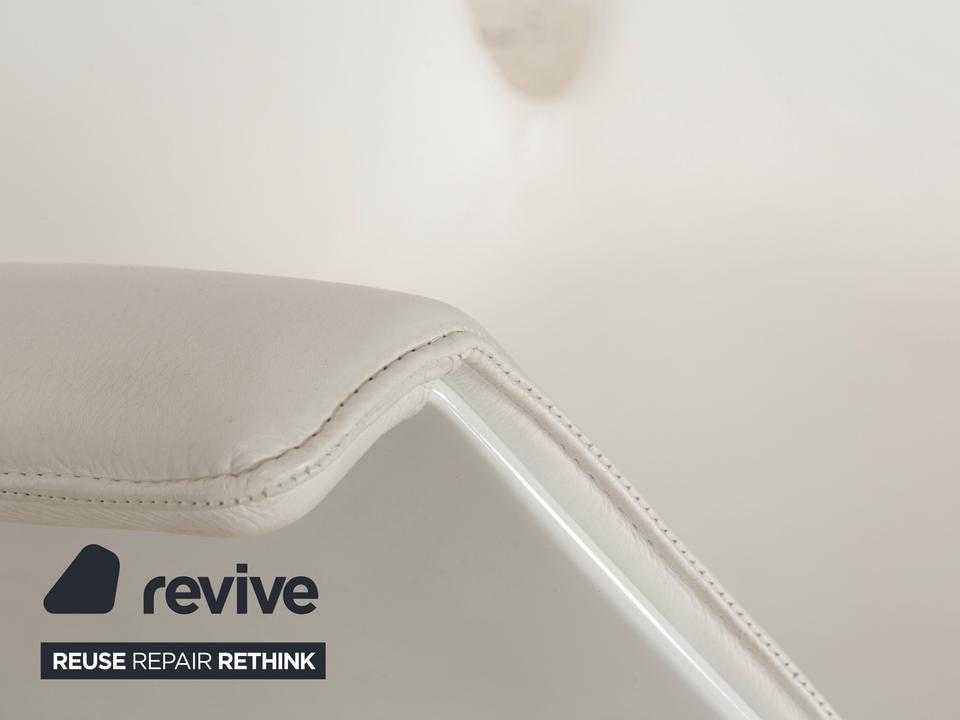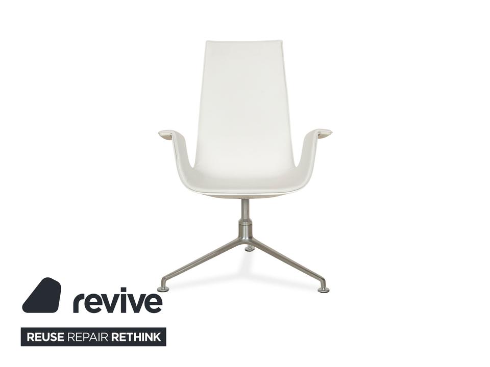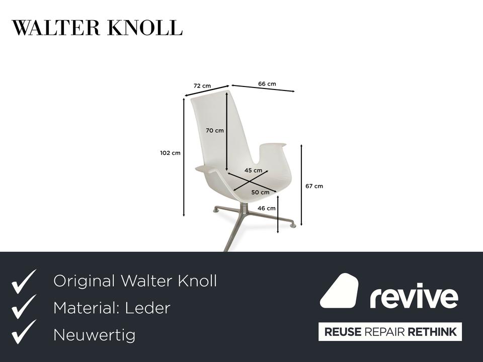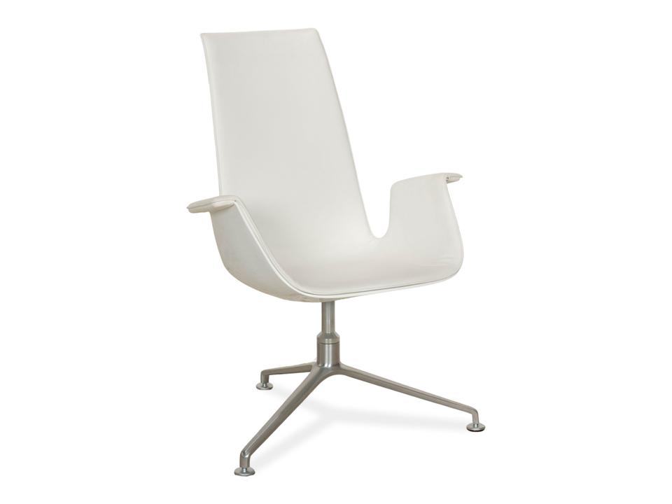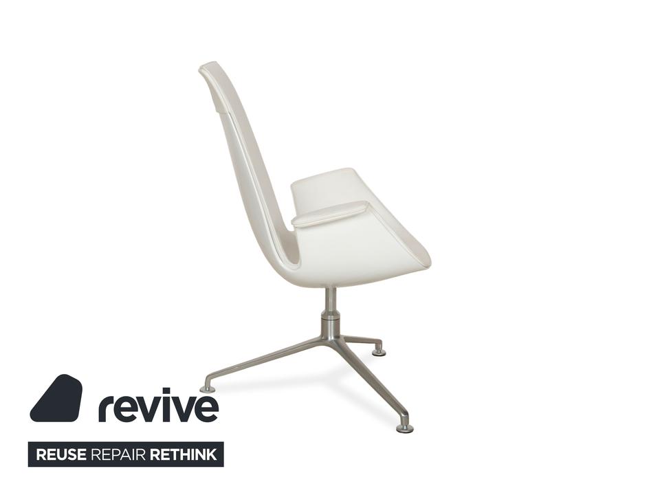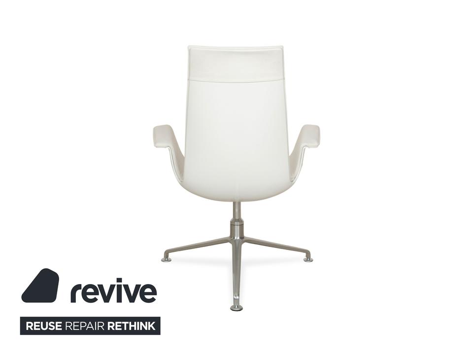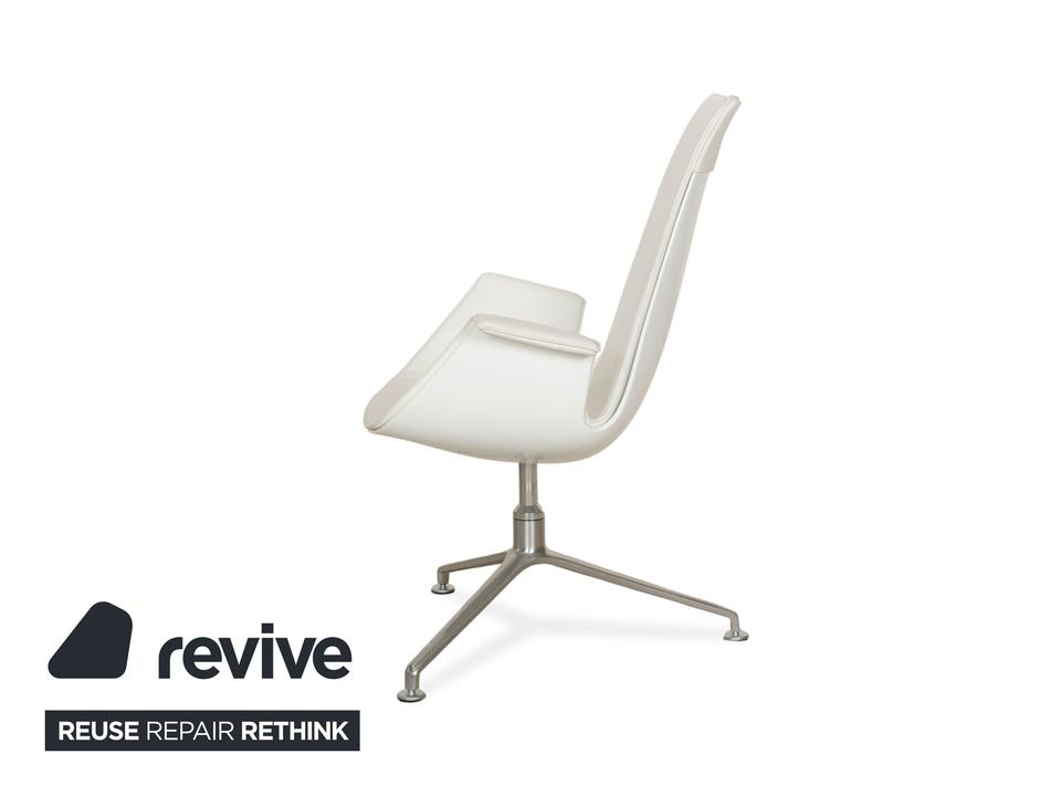 Der Sessel FK von Walter Knoll ist mit einem weißen Echtleder bezogen und steht auf einem Dreifuß. Der Schalensessel zeichnet sich durch seine stilvolle, schlichte Optik aus und bietet zusätzlich Komfort durch seine Drehfunktion.