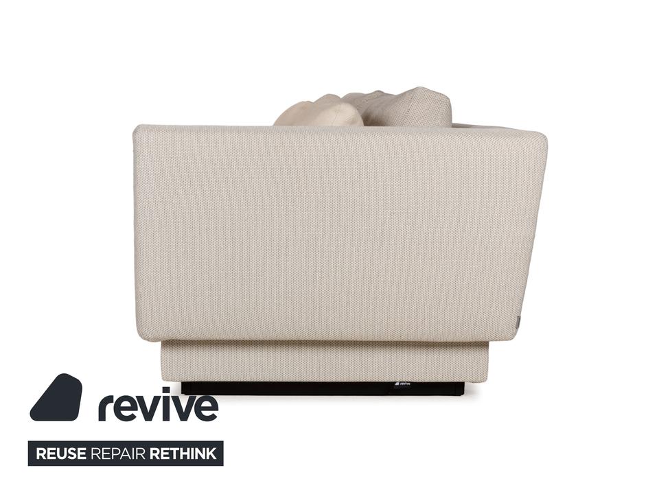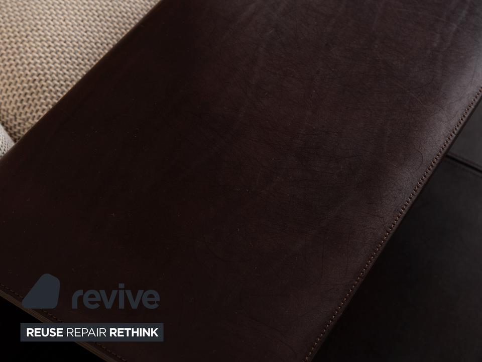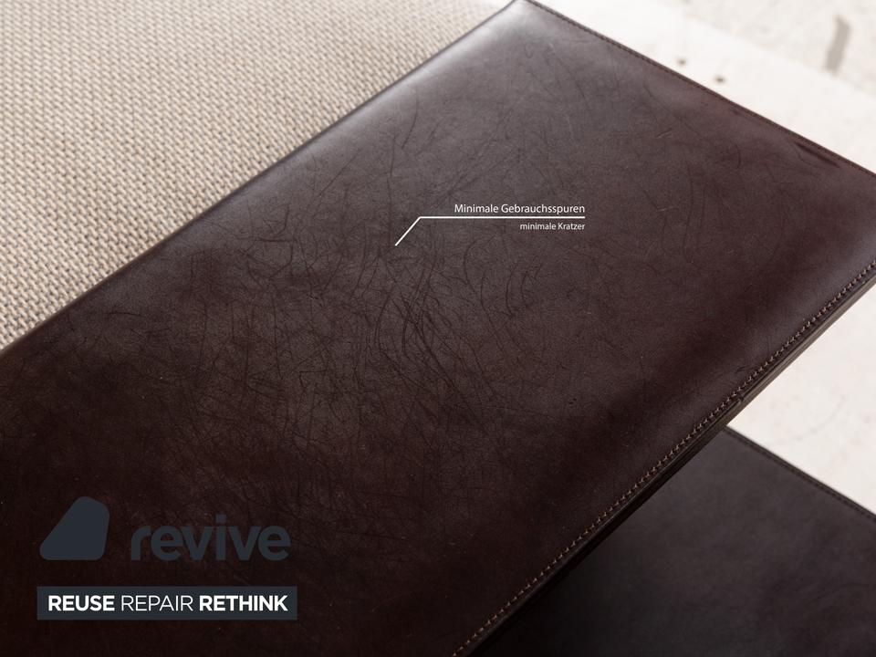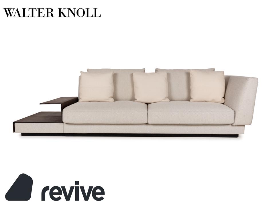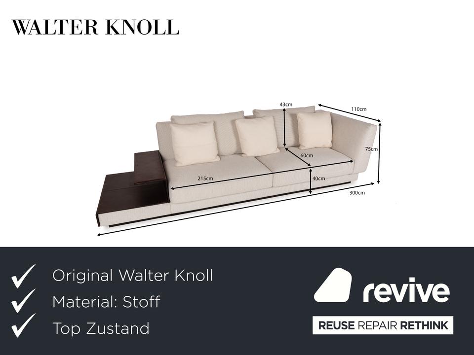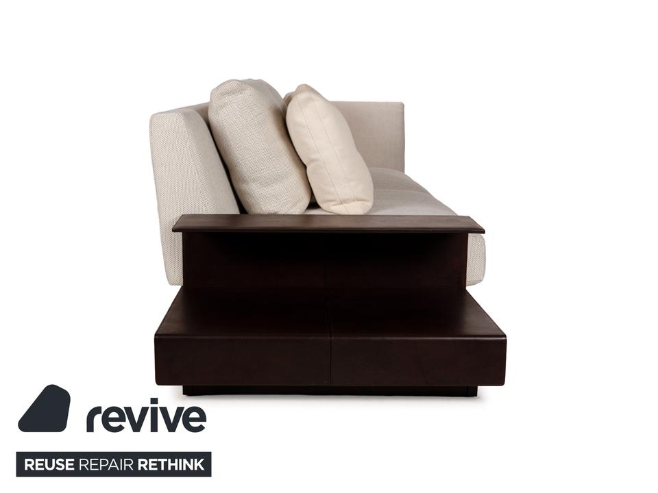 Das Sofa Grand Suite von Walter Knoll ist ein Zeichen für gelungenes Design und gutes Handwerk. Montiert auf einem durchgehenden Podest aus dunklem Holz, ist der Korpus dieses Eclsofas mit cremefarbenen Stoff bezogen und verfügt über elegante Ablagen mit Bezug aus dunkelbraunem Leder. Kissen in einem leicht anderen Farbton setzen Akzente, der Kontrast zwischen den unterschiedlichen Farben und Materialien kommt gut zu tragen. Die asymmetrische Grundform ist schon ein Highlight an sich, aber die hervorragende Verarbeitung macht dieses Möbelstück zu etwas ganz besonderem.