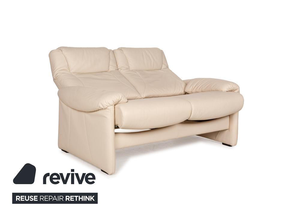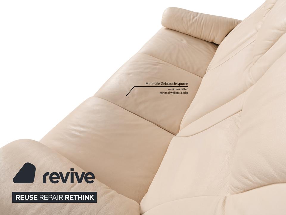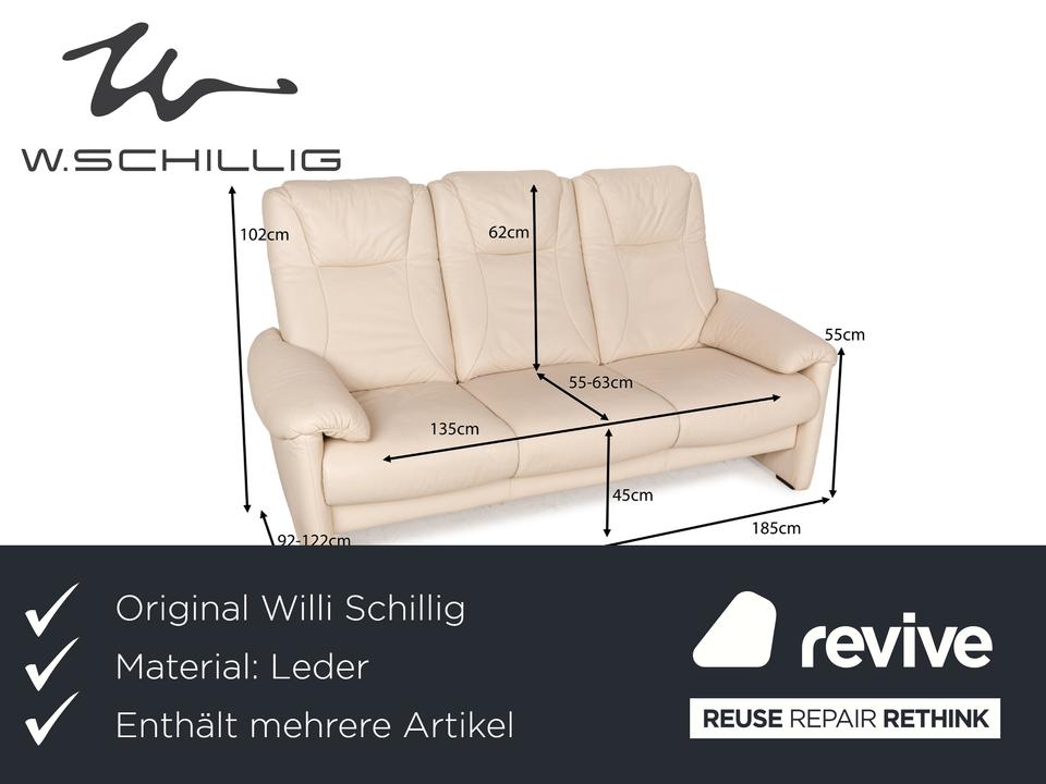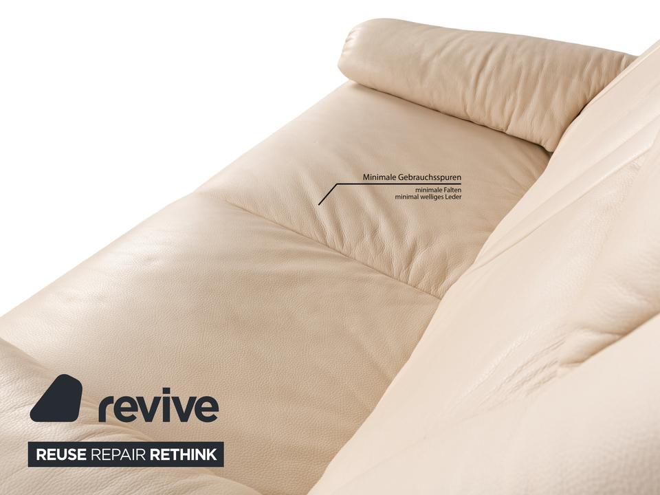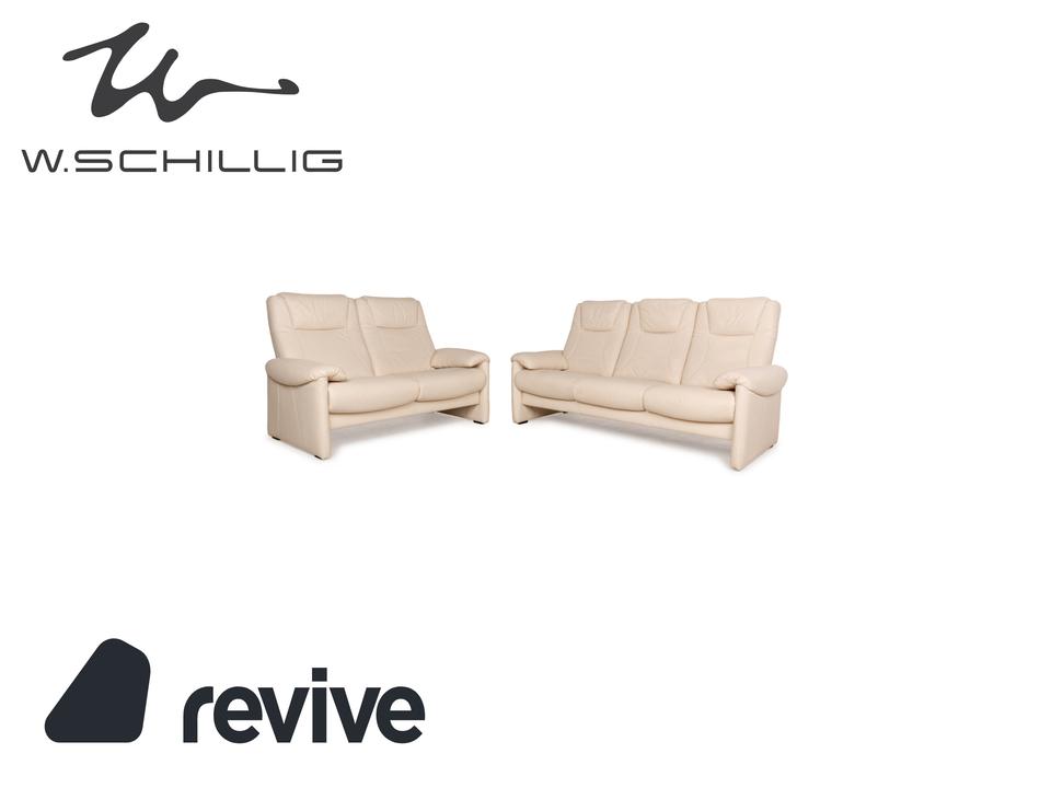 Die Sofa-Garnitur von Willi Schillig ist mit einem cremefarbenen Leder bezogen und steht auf bodentiefen Seitenteilen. Das Set, bestehend aus einem Dreisitzer sowie einem Zweisitzer, zeichnet sich durch sein klassisches Design mit hoher Rückenlehne und breiten Armlehnen aus. Komfort wird bei diesen Sofas groß geschrieben, denn die Rückenlehnen lassen sich nach hinten neigen, wodurch eine Relaxposition eingenommen werden kann.