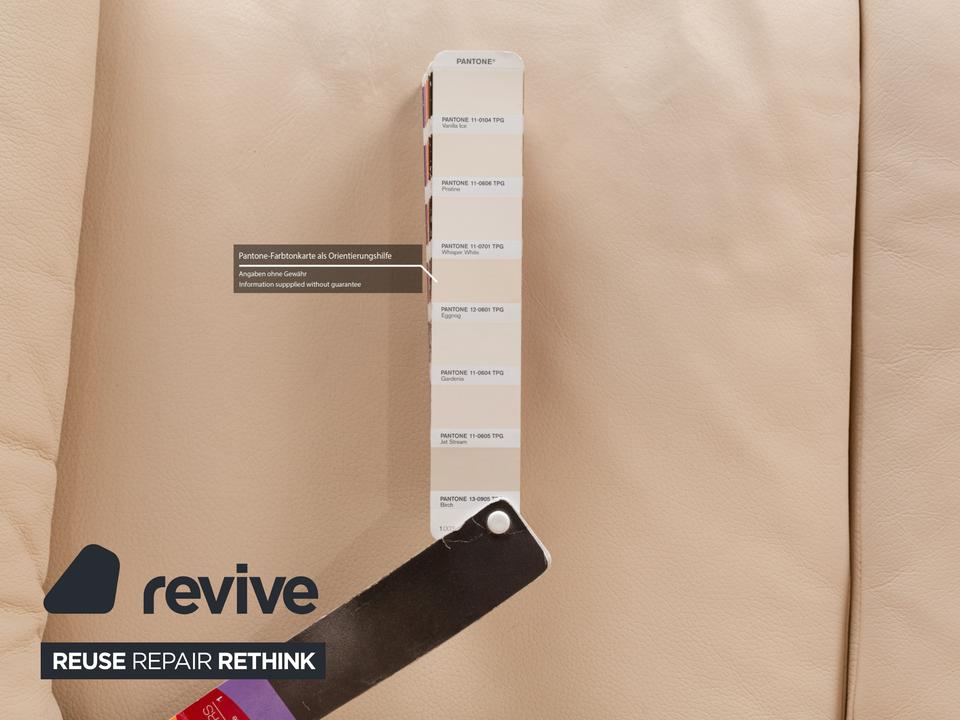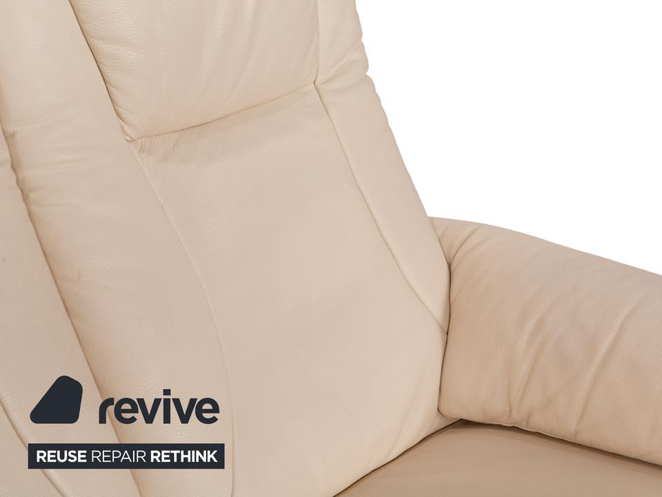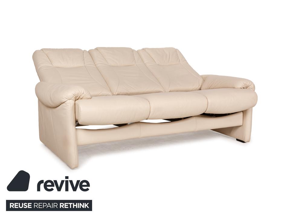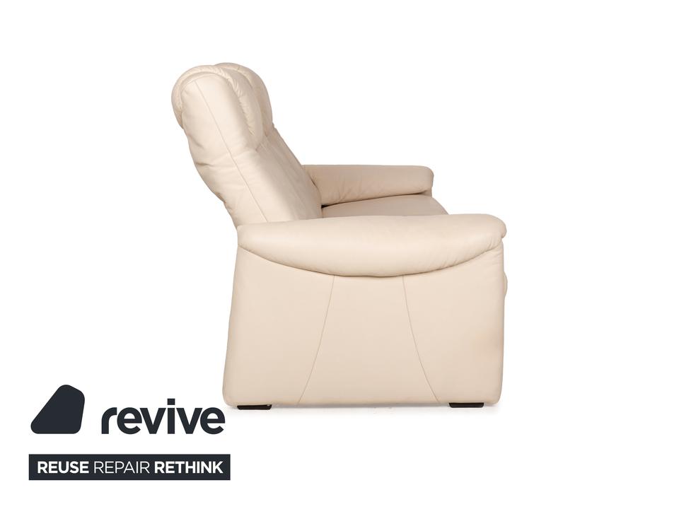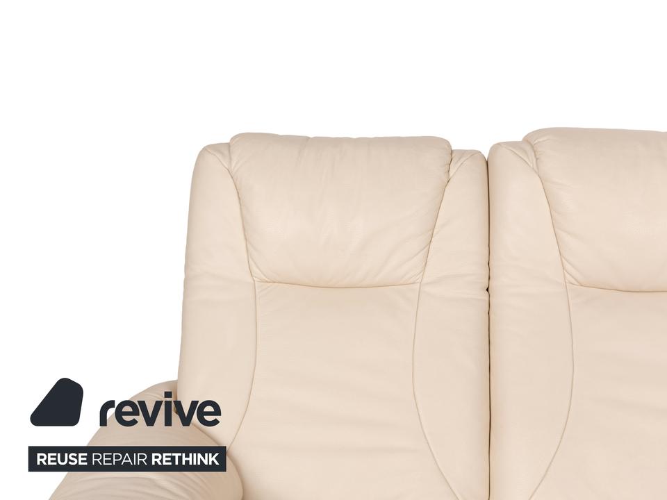 Die Sofa-Garnitur von Willi Schillig ist mit einem cremefarbenen Leder bezogen und steht auf bodentiefen Seitenteilen. Das Set, bestehend aus einem Dreisitzer sowie einem Zweisitzer, zeichnet sich durch sein klassisches Design mit hoher Rückenlehne und breiten Armlehnen aus. Komfort wird bei diesen Sofas groß geschrieben, denn die Rückenlehnen lassen sich nach hinten neigen, wodurch eine Relaxposition eingenommen werden kann.