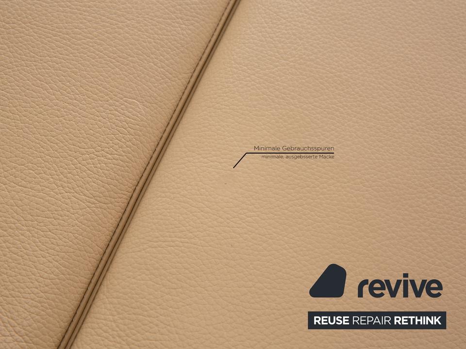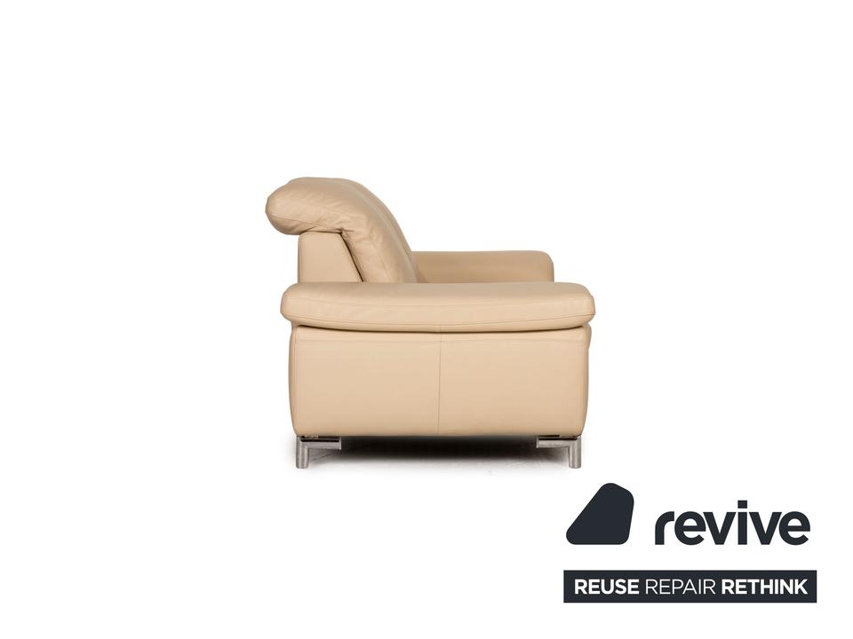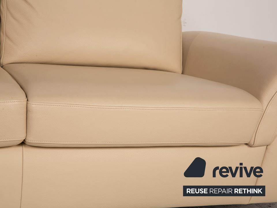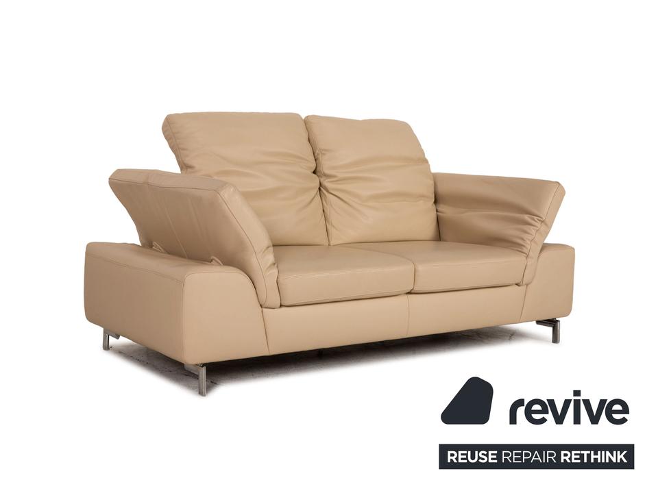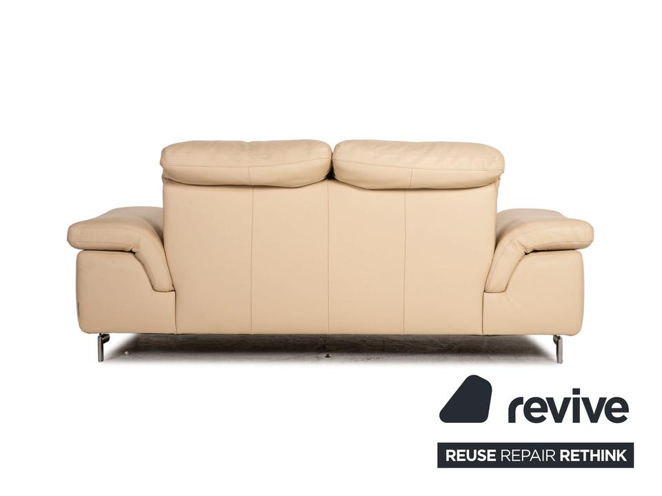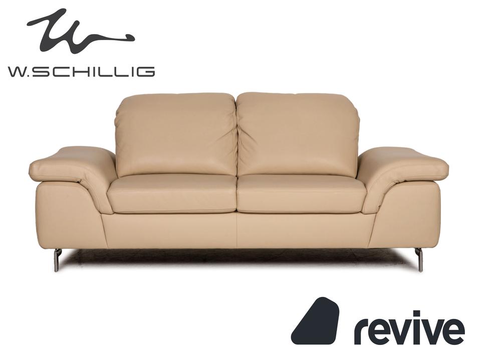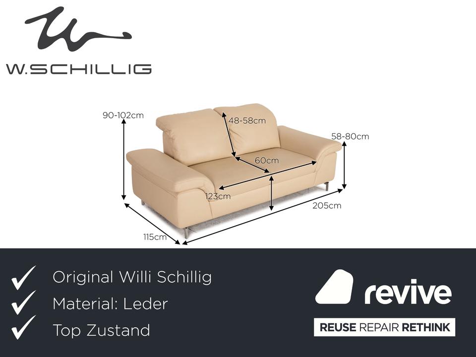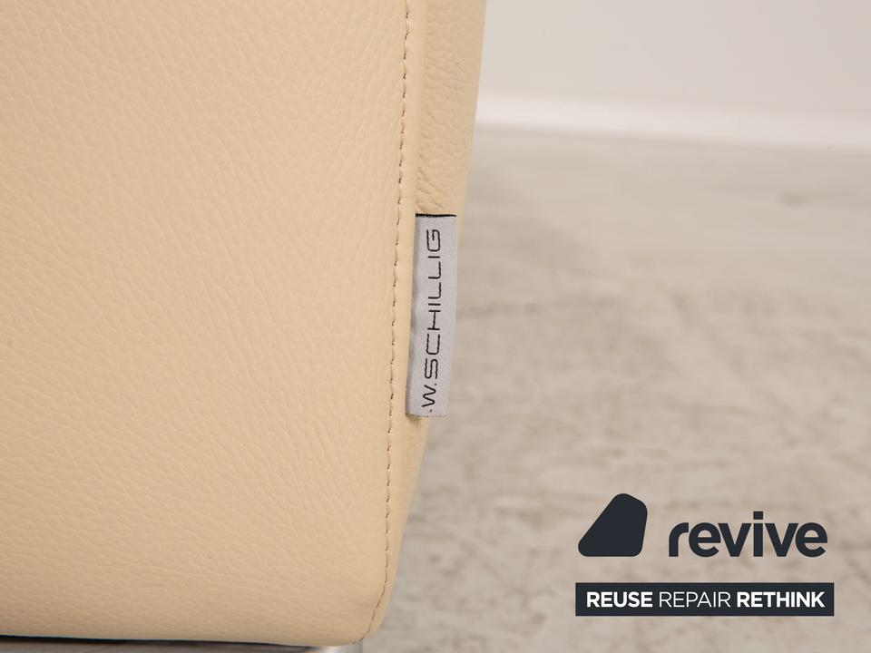 Das Willi Schillig Sofa ist mit einem cremefarbenen Echtleder bezogen und steht auf silbernen Metallfüßen. Das klassische Design und die abgerundeten Armlehnen zeichnen den Zweisitzer aus.
