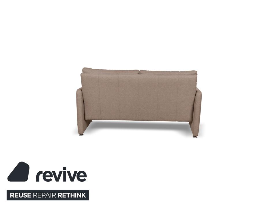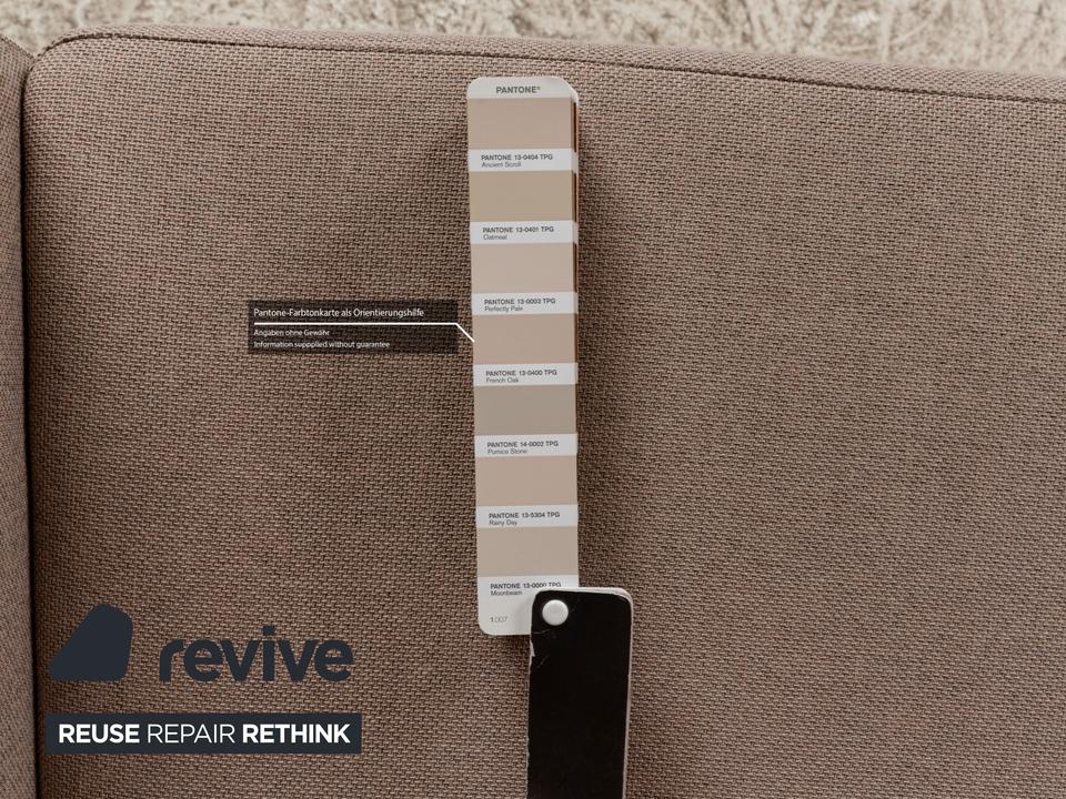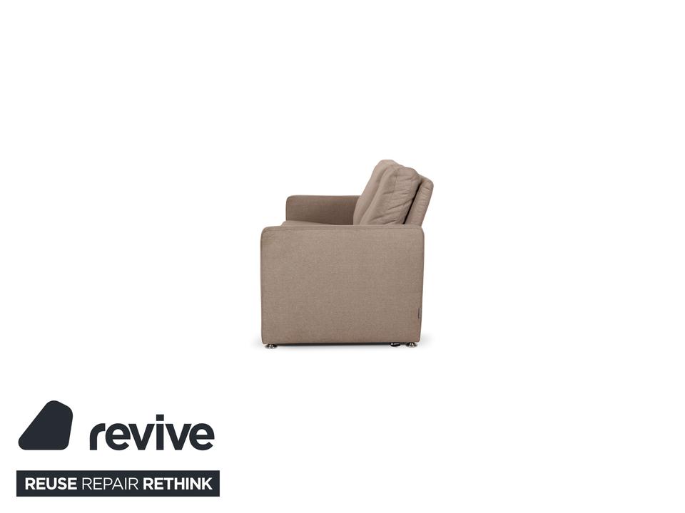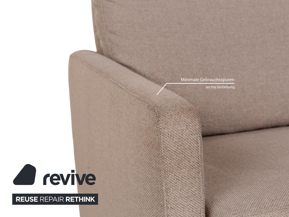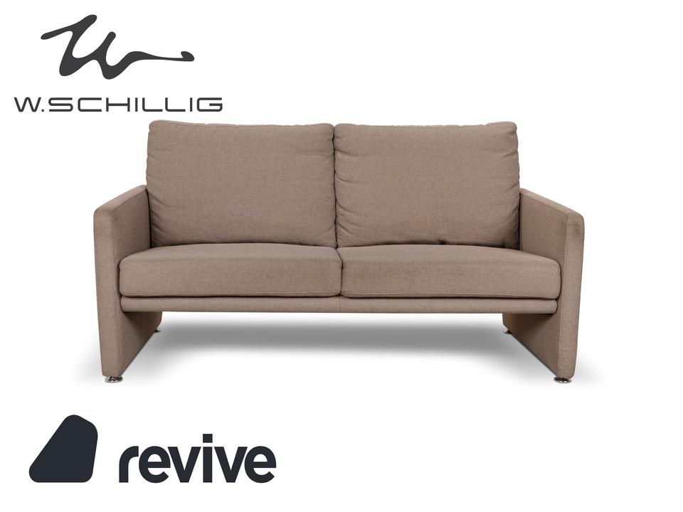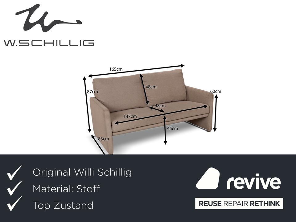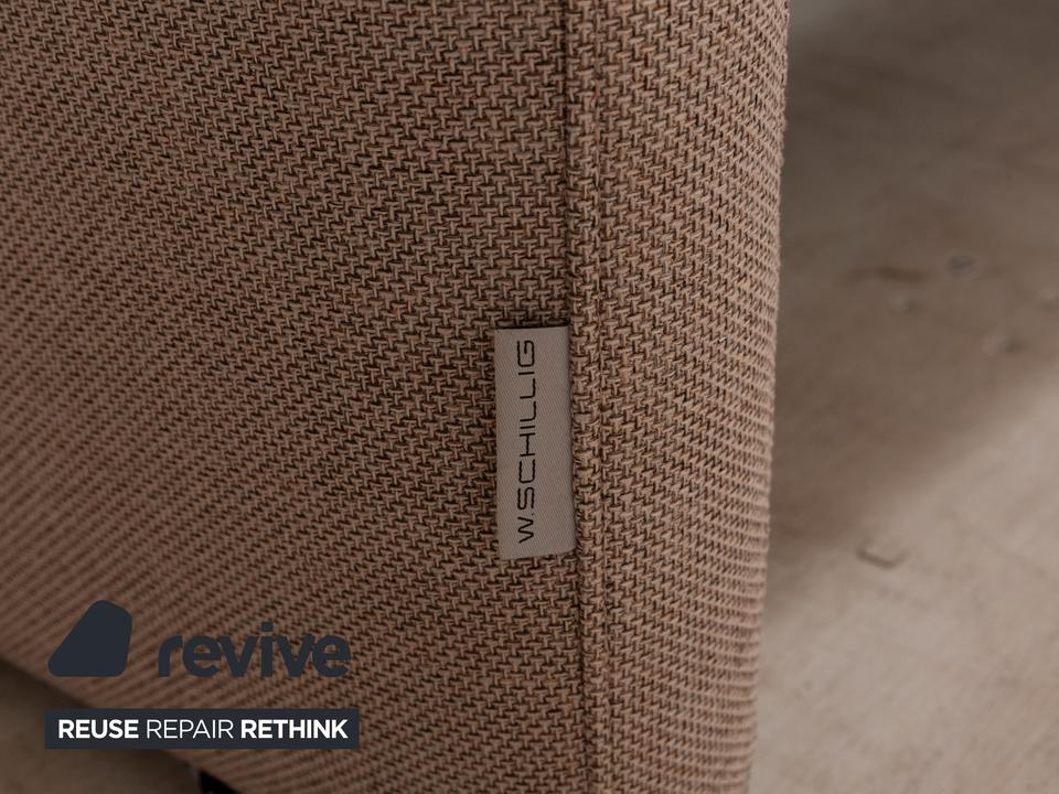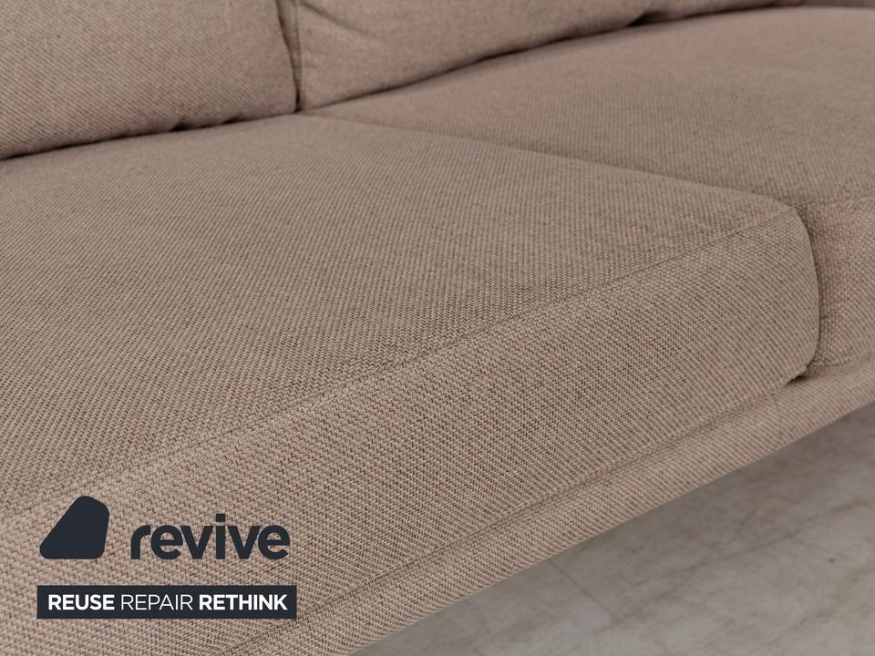 Das Sofa von Willi Schillig ist mit einem beigefarbenen Stoff bezogen und zeichnet sich durch sein reduziertes, schlichtes Design aus. Die bodentiefen Armlehnen des Dreisitzers sorgen für eine abgerundete Optik. Hohe Rückenlehnenpolster sorgen für Komfort.