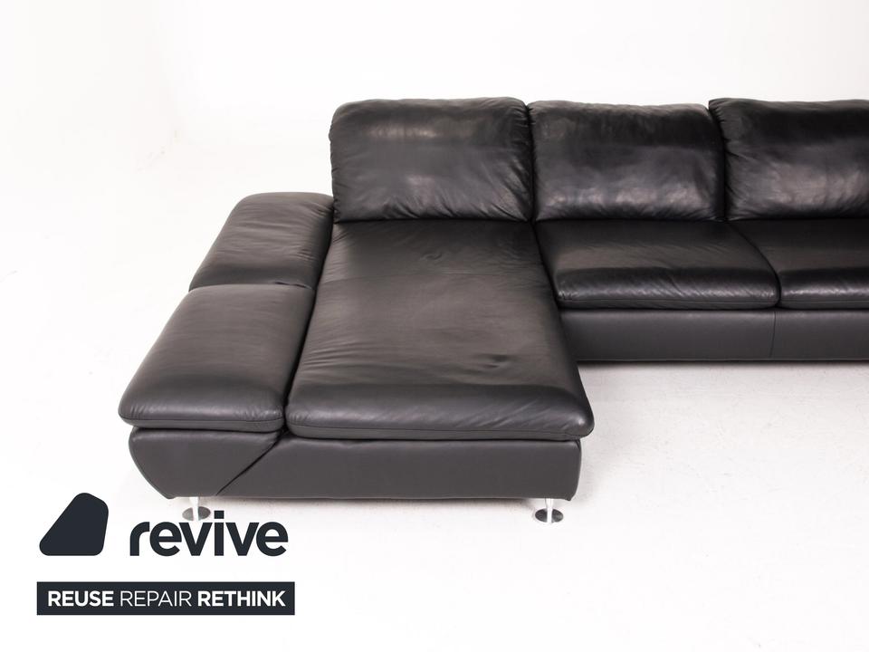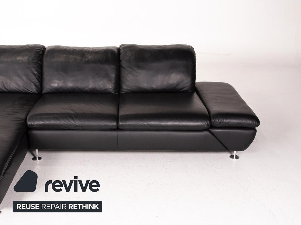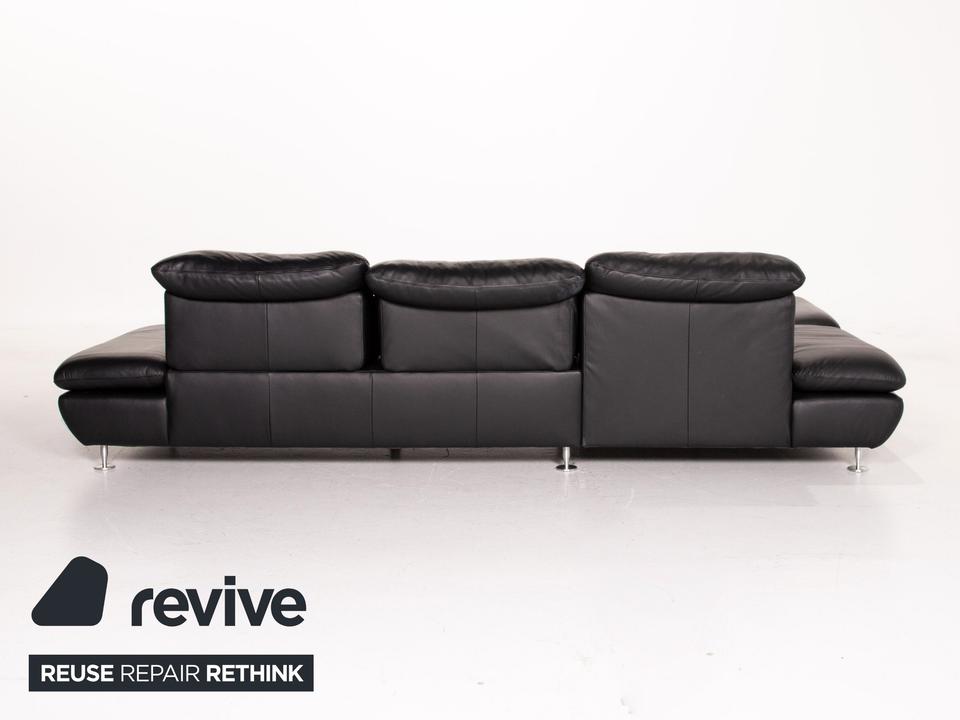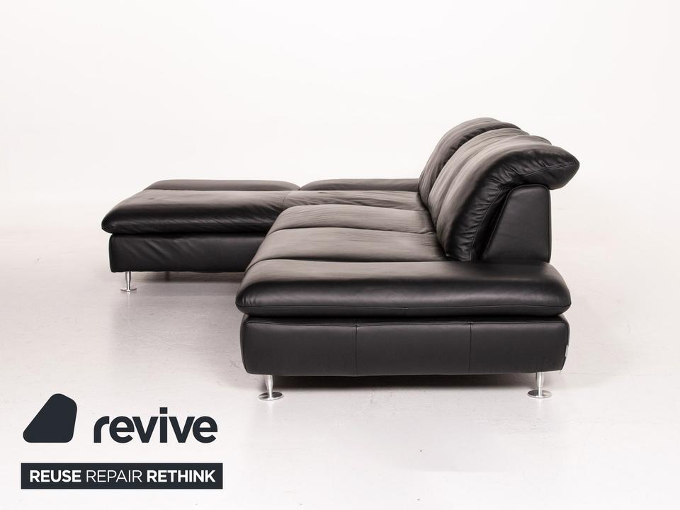 Das Ecksofa Taoo von Willi Schillig ist mit einem schwarzen Echtleder bezogen und steht auf schlanken Metallfüßen. Der Kopfbereich der Rückenlehnen kann nach hinten geneigt werden, Drei Armlehnen können hochgeklappt werden.