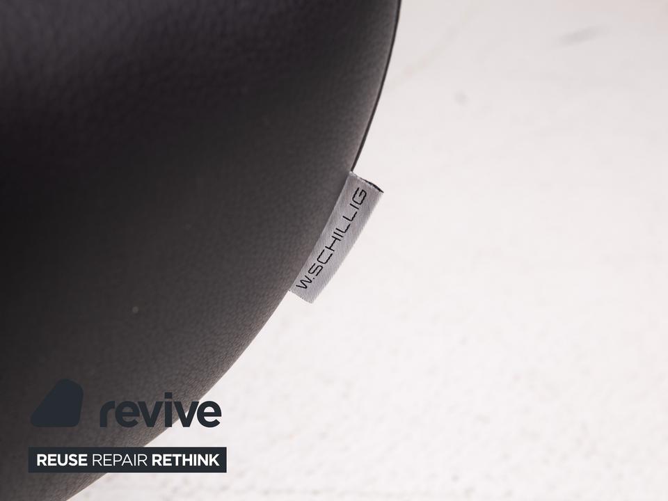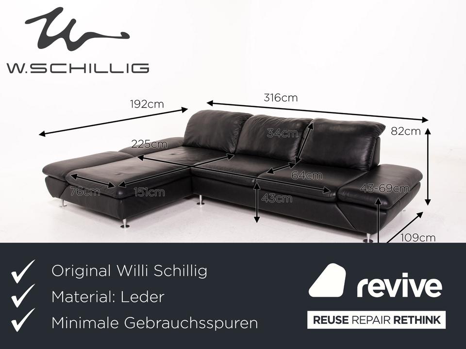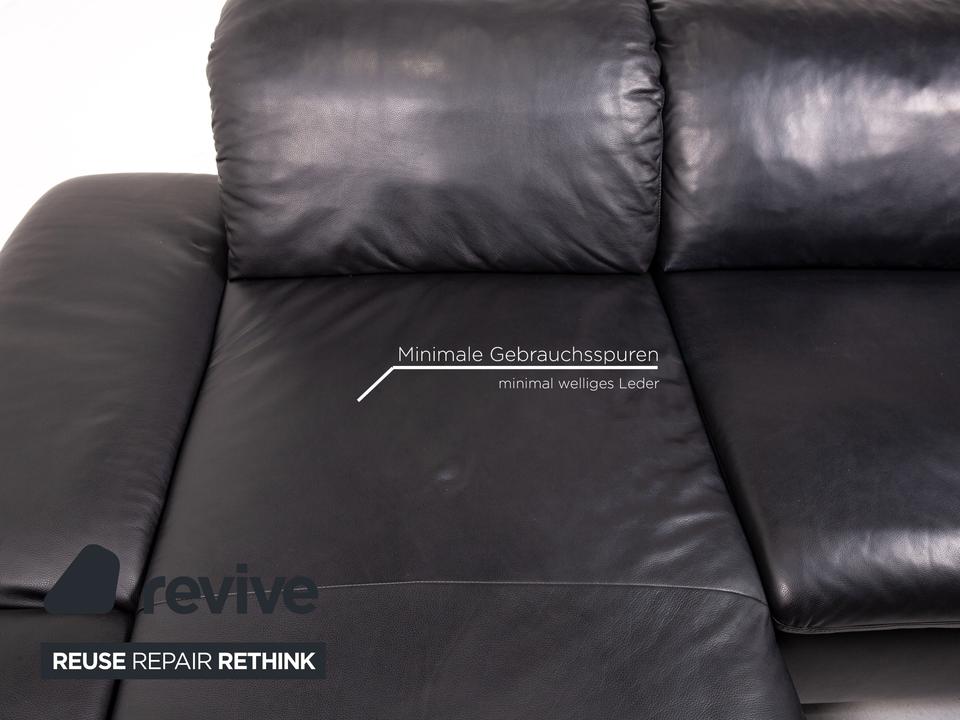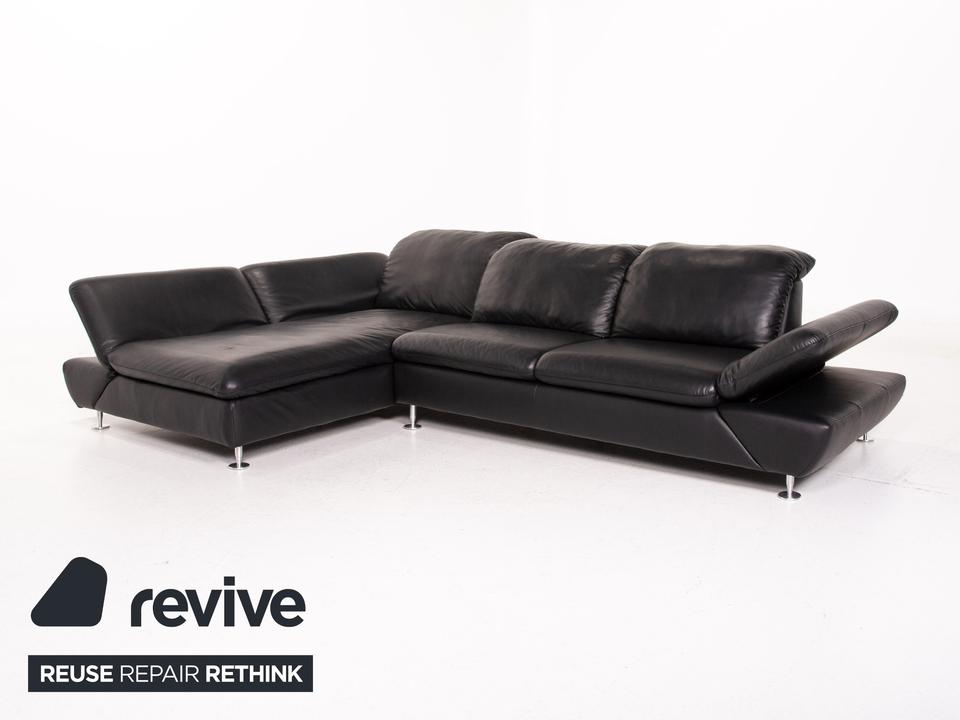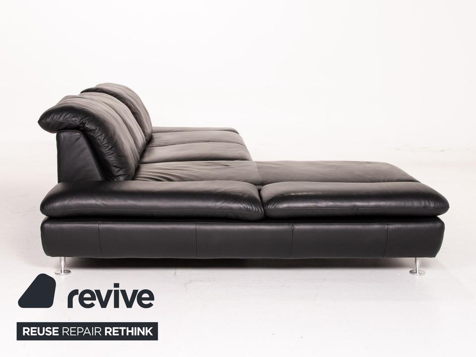 Das Ecksofa Taoo von Willi Schillig ist mit einem schwarzen Echtleder bezogen und steht auf schlanken Metallfüßen. Der Kopfbereich der Rückenlehnen kann nach hinten geneigt werden, Drei Armlehnen können hochgeklappt werden.