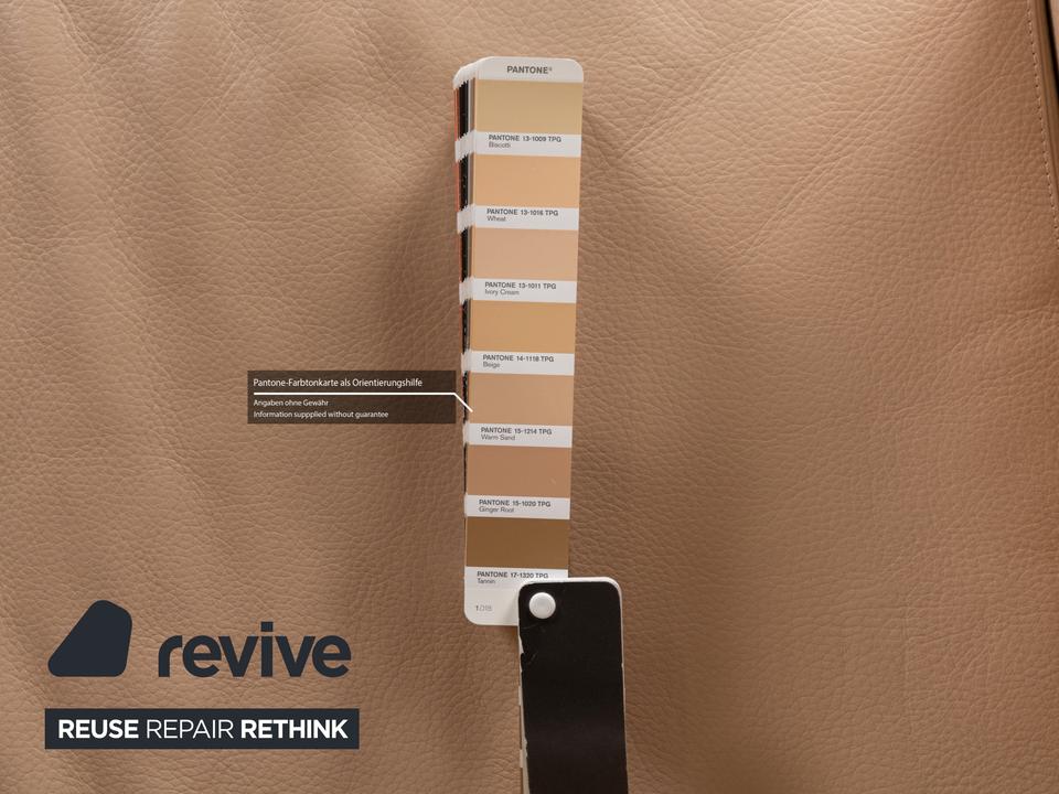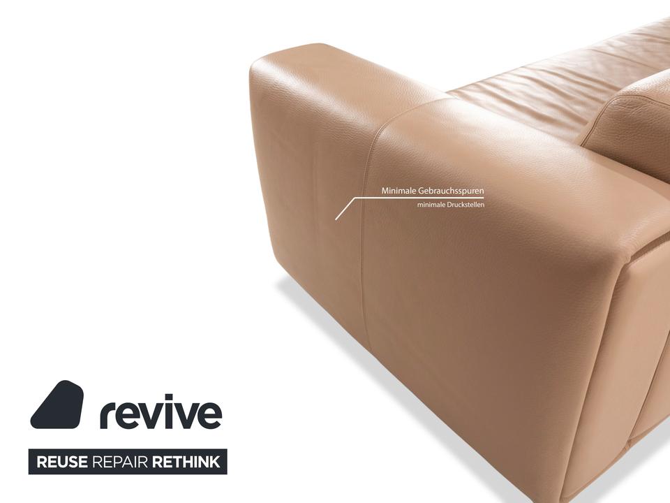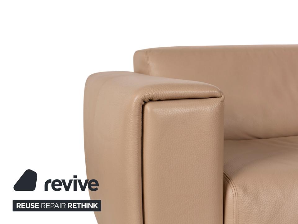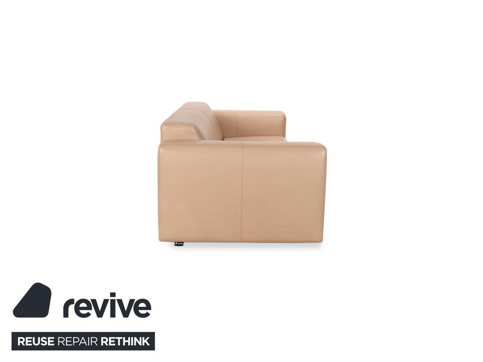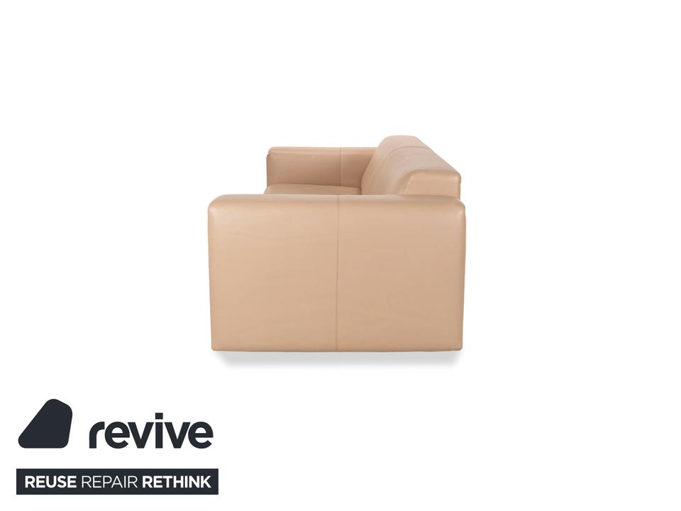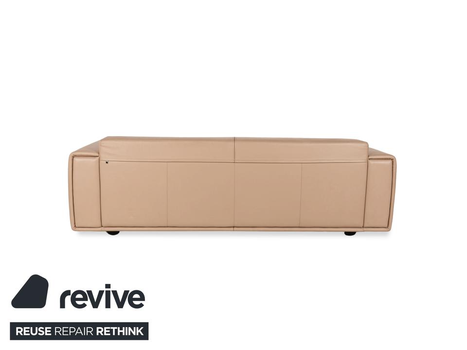 Der Dreisitzer von WK Wohnen ist mit einem beigen Echtleder bezogen und steht auf unauffälligen Füßen. Er zeichnet sich durch das schlichte, zeitlose Design und die klassische Optik aus.