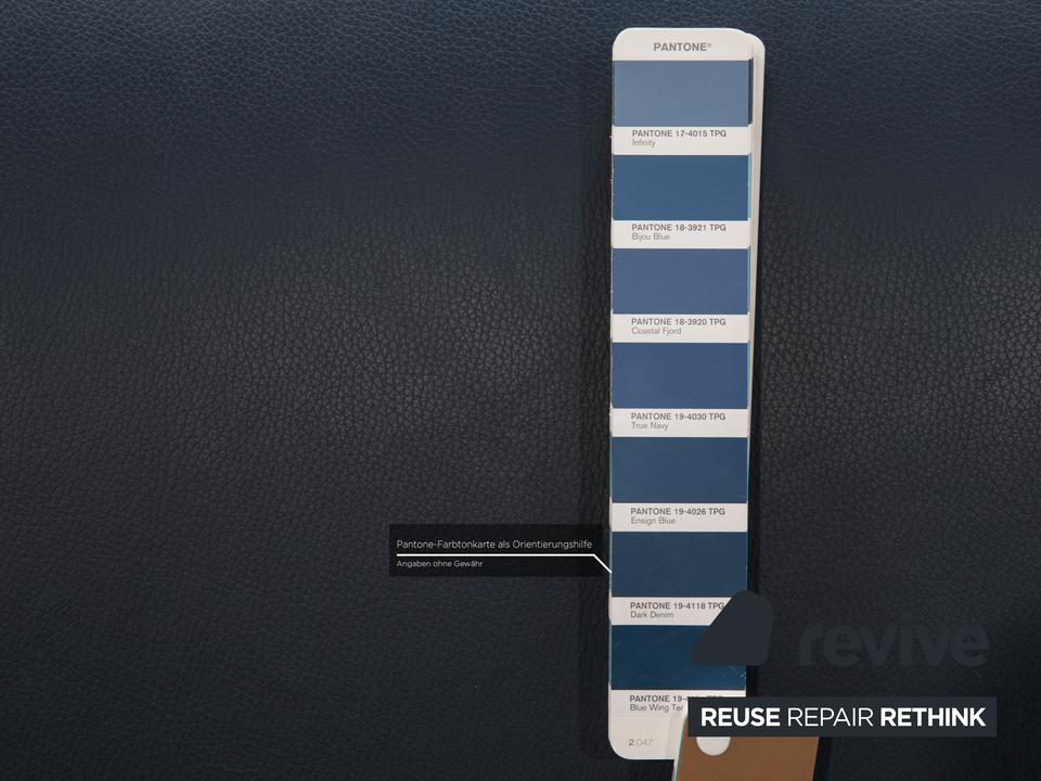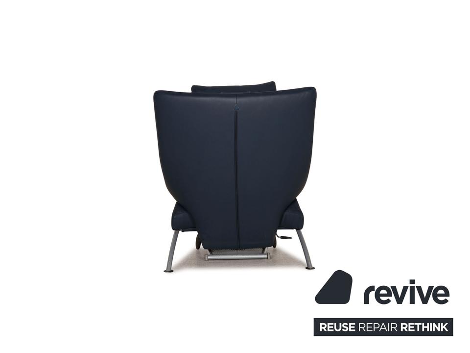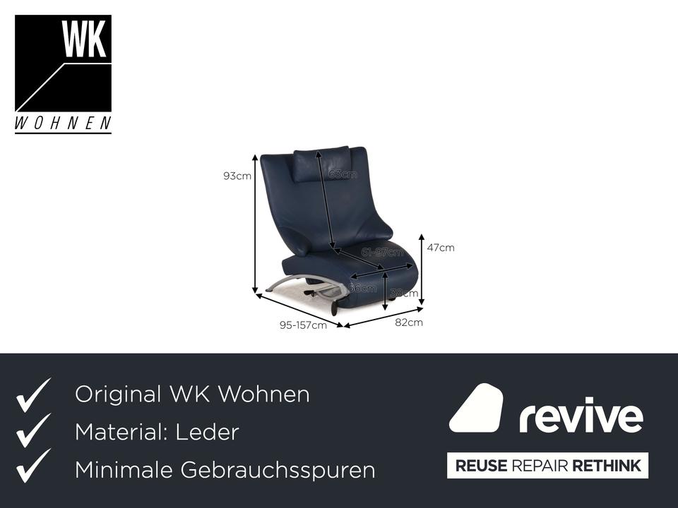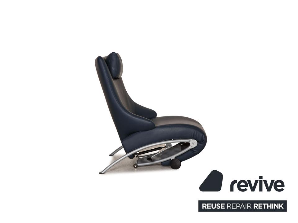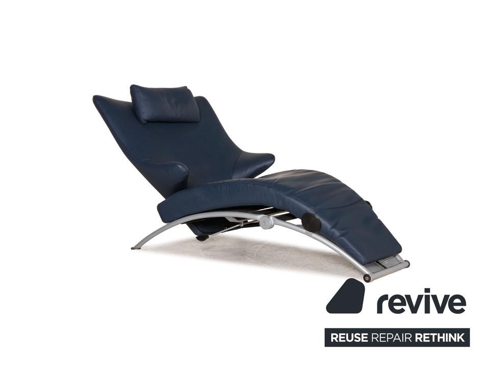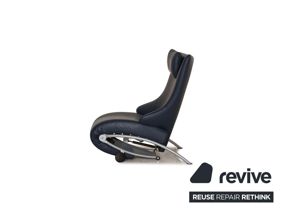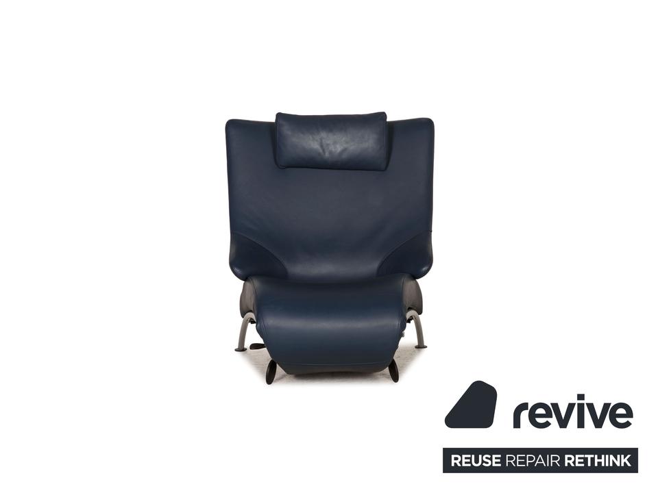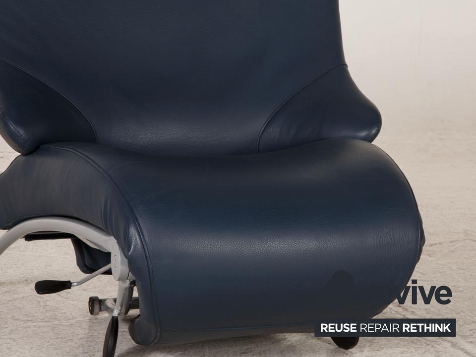 Der Sessel Solo 699 von WK Wohnen ist mit einem blauen Echtleder bezogen und steht auf schmalen, silbernen Metallfüßen. Er zeichnet sich durch seine komfortable Relaxfunktion und das extravagante, auffällige Design aus.