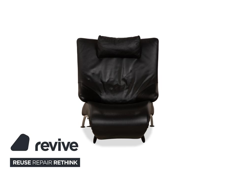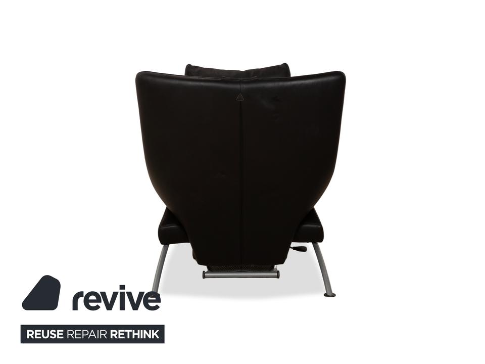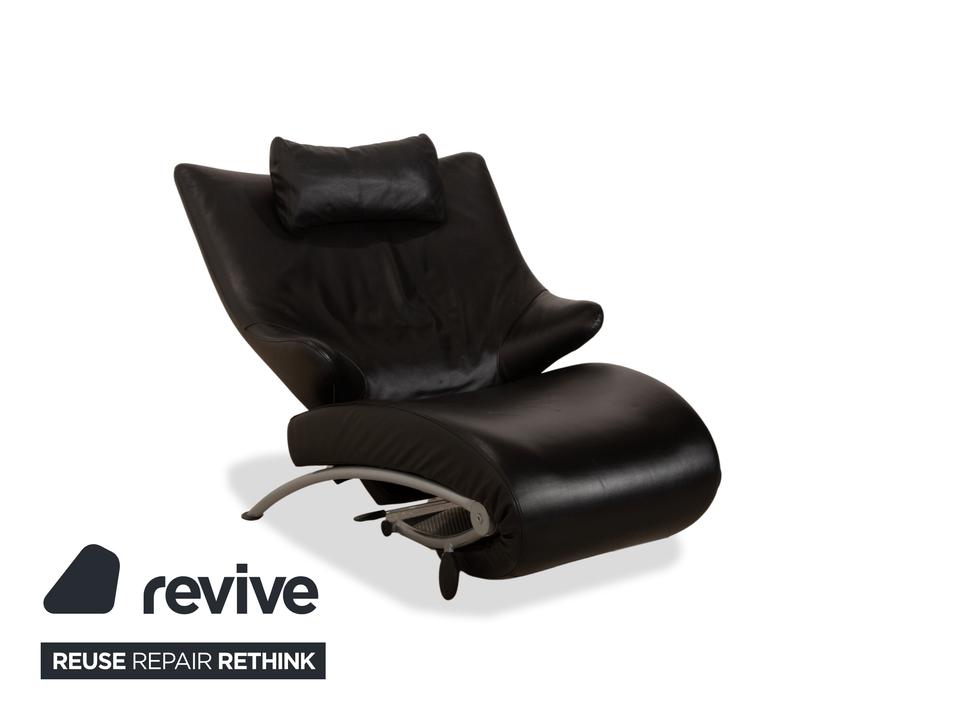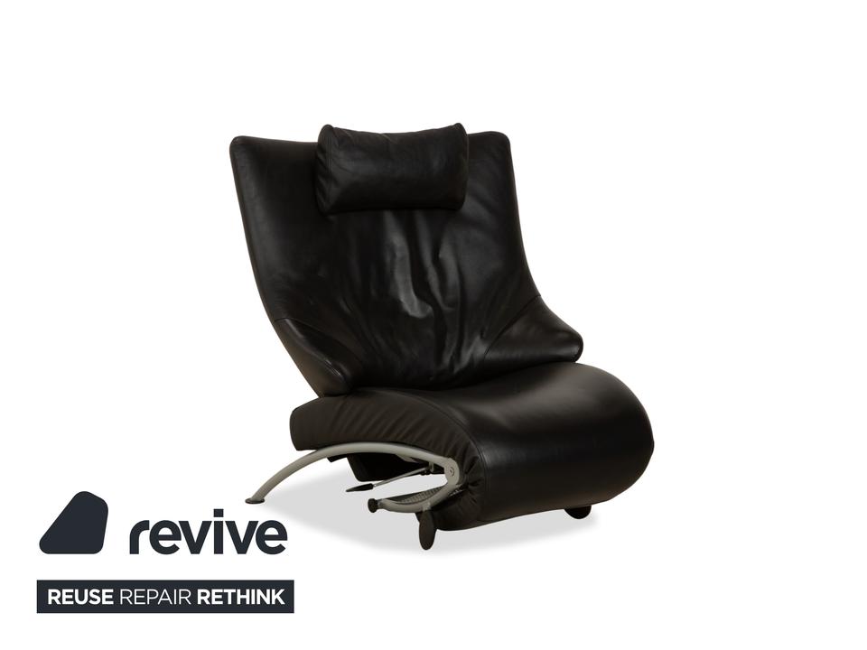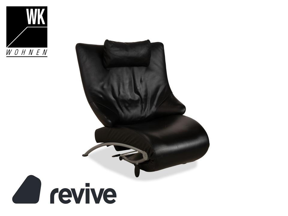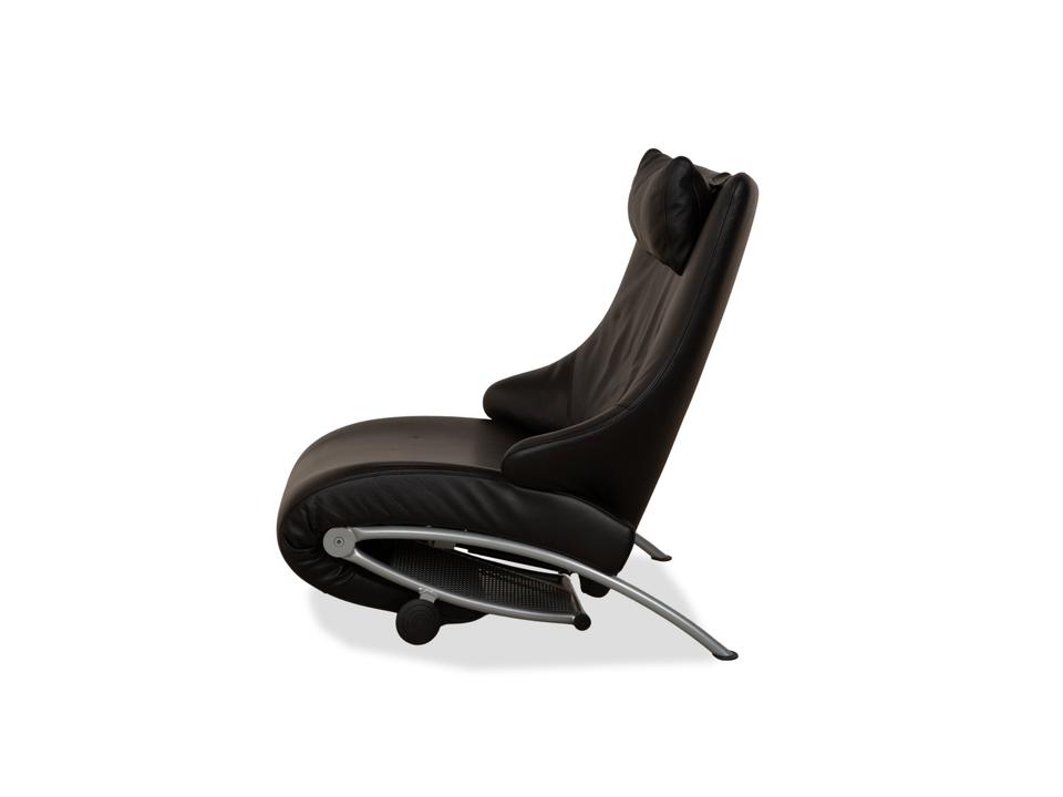 Der Sessel Solo 699 von WK Wohnen ist mit einem schwarzen Echtleder bezogen und steht auf schmalen, silbernen Metallfüßen. Er zeichnet sich durch seine komfortable Relaxfunktion und das extravagante, auffällige Design aus.