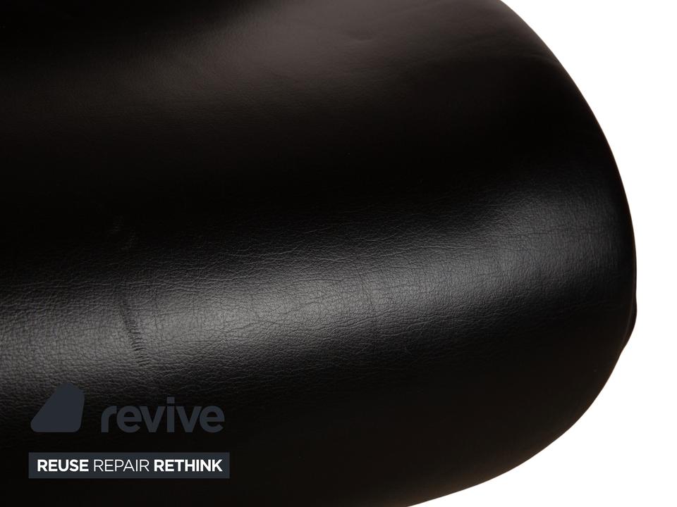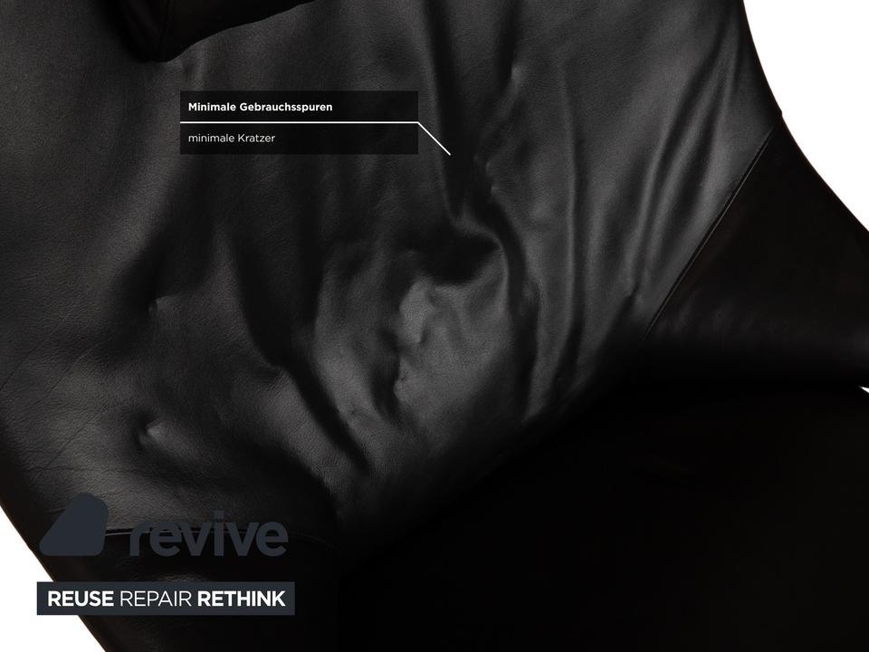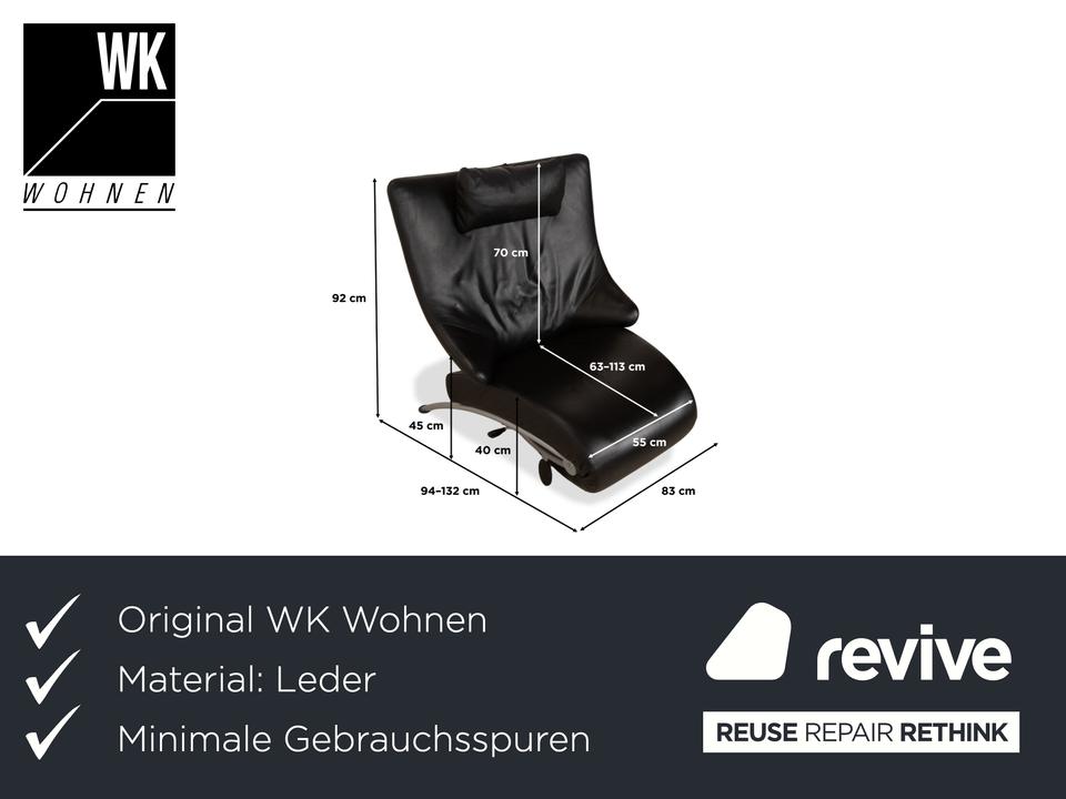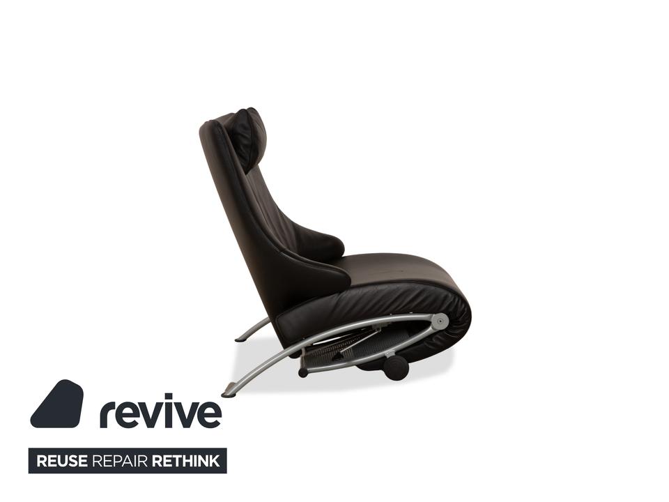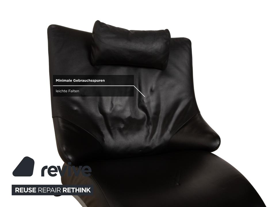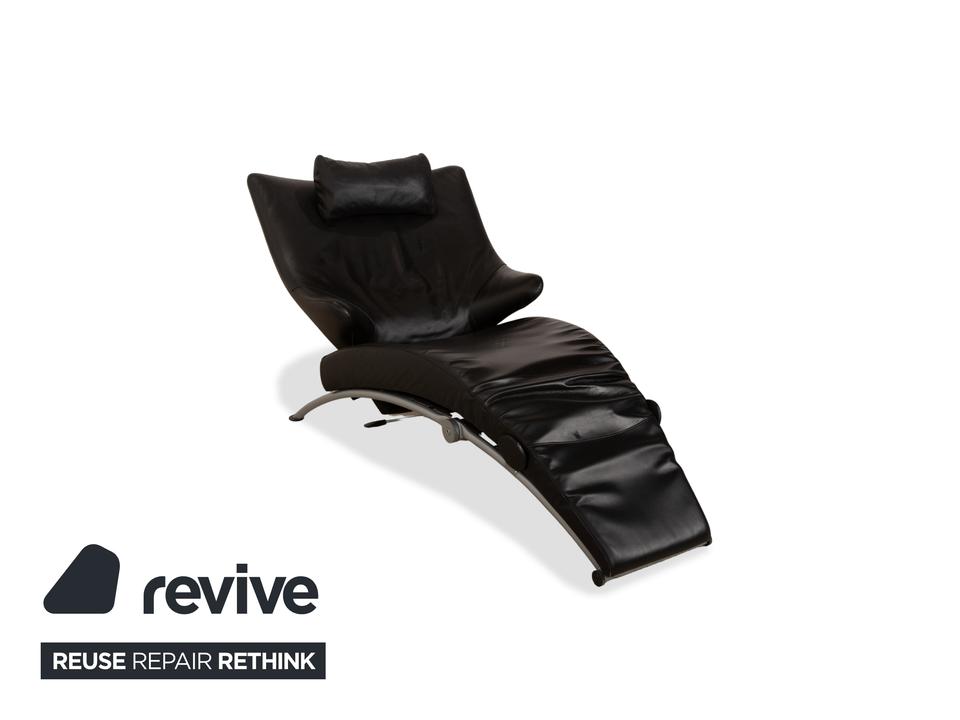 Der Sessel Solo 699 von WK Wohnen ist mit einem schwarzen Echtleder bezogen und steht auf schmalen, silbernen Metallfüßen. Er zeichnet sich durch seine komfortable Relaxfunktion und das extravagante, auffällige Design aus.